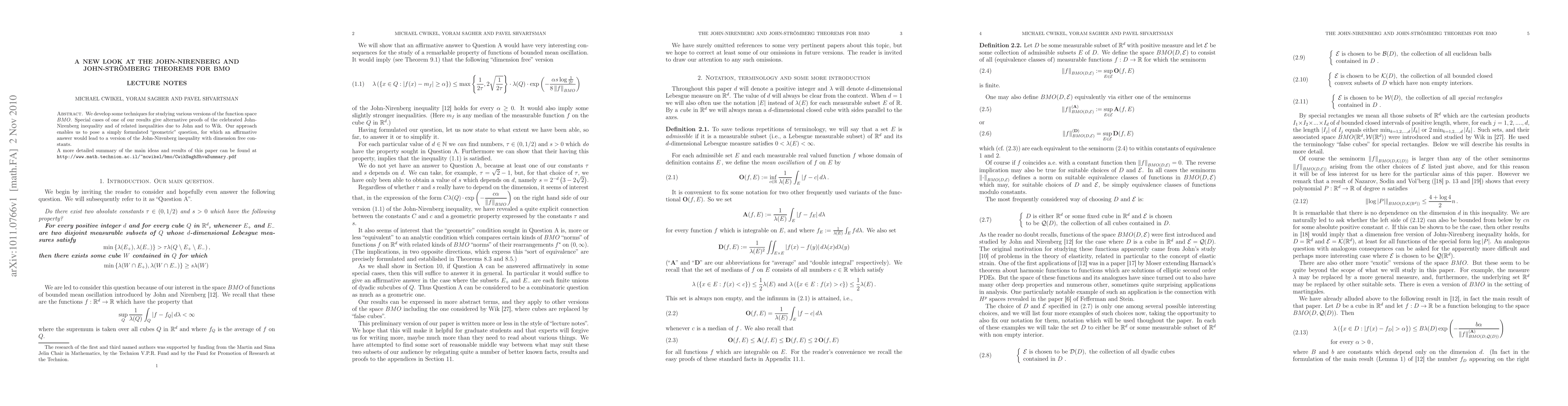 We develop some techniques for studying various versions of the function space BMO. Special cases of one of our results give alternative proofs of the celebrated John- Nirenberg inequality and of related inequalities due to John and to Wik. Our approach enables us to pose a simply formulated "geometric" question, for which an affirmative answer would lead to a version of the John-Nirenberg inequality with dimension free constants. A more detailed summary of the main ideas and results of this paper can be found at http://www.math.technion.ac.il/~mcwikel/bmo/CwikSaghShvaSummary.pdf
