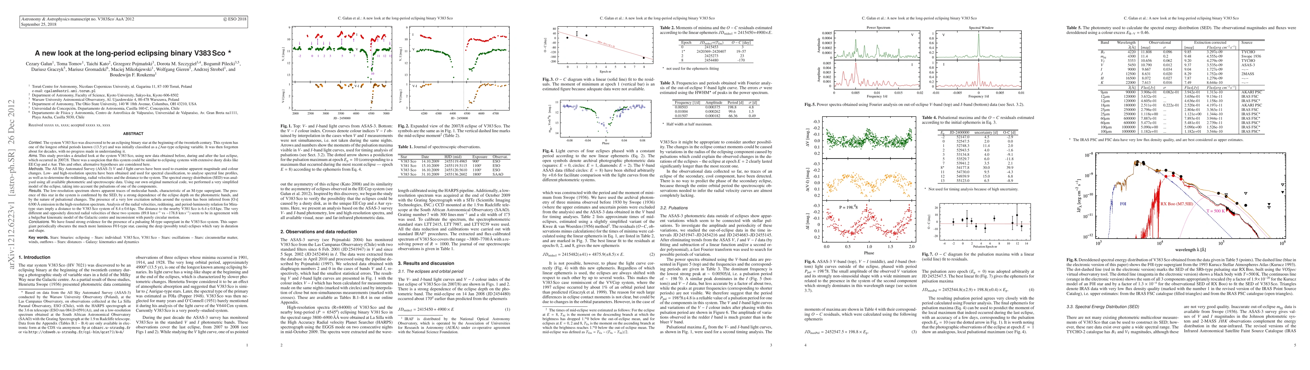 V383Sco was discovered to be an eclipsing binary at the beginning of the XX century. This system has one of the longest orbital periods known (13.5yr) and was initially classified as a zet_Aur-type variable. It was then forgotten for decades. This study provides a detailed look at the V383Sco, using new data obtained around the last eclipse in 2007/8. There was a suspicion that this system could be similar to eclipsing systems with extensive dusty disks like EECep and eps_Aur. This and other, alternative hypotheses are considered. The ASAS-3 VI light curves have been used to examine photometric changes. Low-(LRS) and high-res.(HRS) spectra have been used for spectral classification, to analyse line profiles, as well as to determine the reddening, radial velocities (RVs) and distance. The SED was analysed. Using original numerical code, we performed a simplified model of the eclipse, taking into account the pulsations of one of the components. The LRS shows traces of molecular bands, characteristic of an M-type supergiant. The presence of this star in the system is confirmed by SED, by a strong dependence of the eclipse depth on the photometric bands, and by pulsational changes. The presence of a low excitation nebula around the system has been inferred from [OI] 6300A emission. Analysis of the RVs, reddening, and P-L relation for Mira-type stars imply a distance to the V383Sco of 8.4+-0.6 kpc. The distance to the nearby V381Sco is 6.4+-0.8 kpc. The very different and oppositely directed RVs of these systems (89.8 vs -178.8 km/s) seem to be in agreement with a bulge/bar kinematic model of the Galactic centre and inconsistent with purely circular motion. We have found evidence for the presence of a pulsating M-type supergiant in the V383Sco which periodically obscures the much more luminous F0I-type star, causing the deep (possibly total) eclipses which vary in duration and shape.