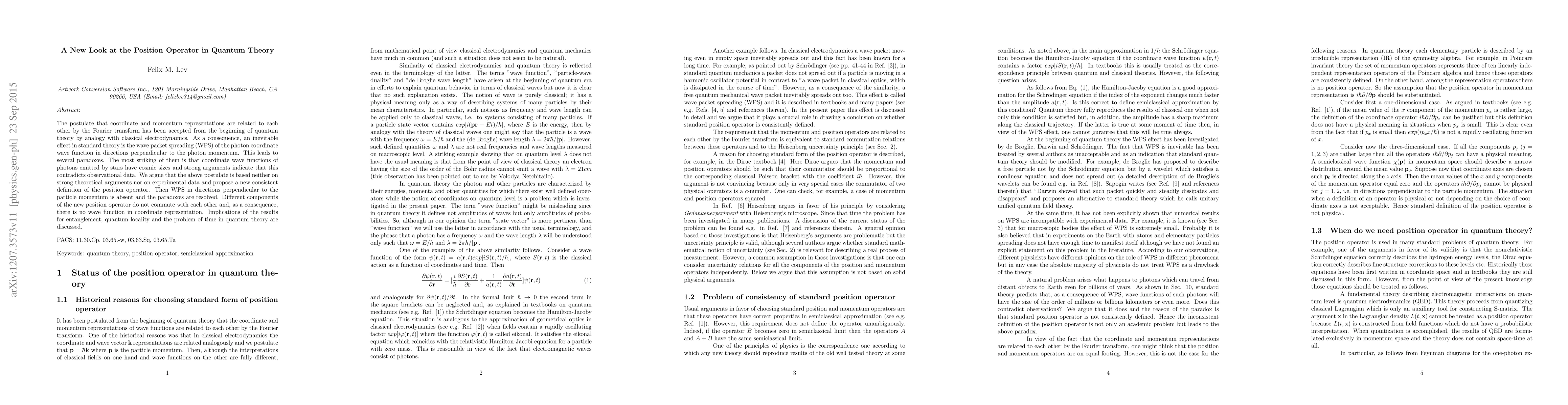 The postulate that coordinate and momentum representations are related to each other by the Fourier transform has been accepted from the beginning of quantum theory by analogy with classical electrodynamics. As a consequence, an inevitable effect in standard theory is the wave packet spreading (WPS) of the photon coordinate wave function in directions perpendicular to the photon momentum. This leads to several paradoxes. The most striking of them is that coordinate wave functions of photons emitted by stars have cosmic sizes and strong arguments indicate that this contradicts observational data. We argue that the above postulate is based neither on strong theoretical arguments nor on experimental data and propose a new consistent definition of the position operator. Then WPS in directions perpendicular to the particle momentum is absent and the paradoxes are resolved. Different components of the new position operator do not commute with each other and, as a consequence, there is no wave function in coordinate representation. Implications of the results for entanglement, quantum locality and the problem of time in quantum theory are discussed.