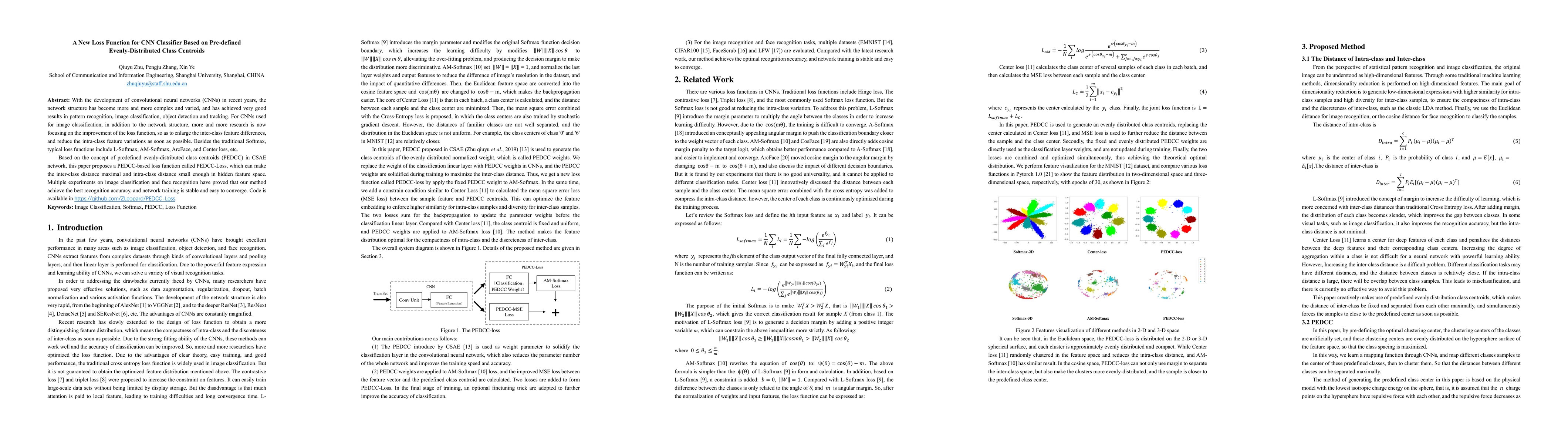 This paper proposes a new PEDCC-Loss function for CNN classifiers, which leverages predefined evenly-distributed class centroids to maximize inter-class distances and minimize intra-class distances in feature space. Experiments show improved recognition accuracy and stable training convergence.