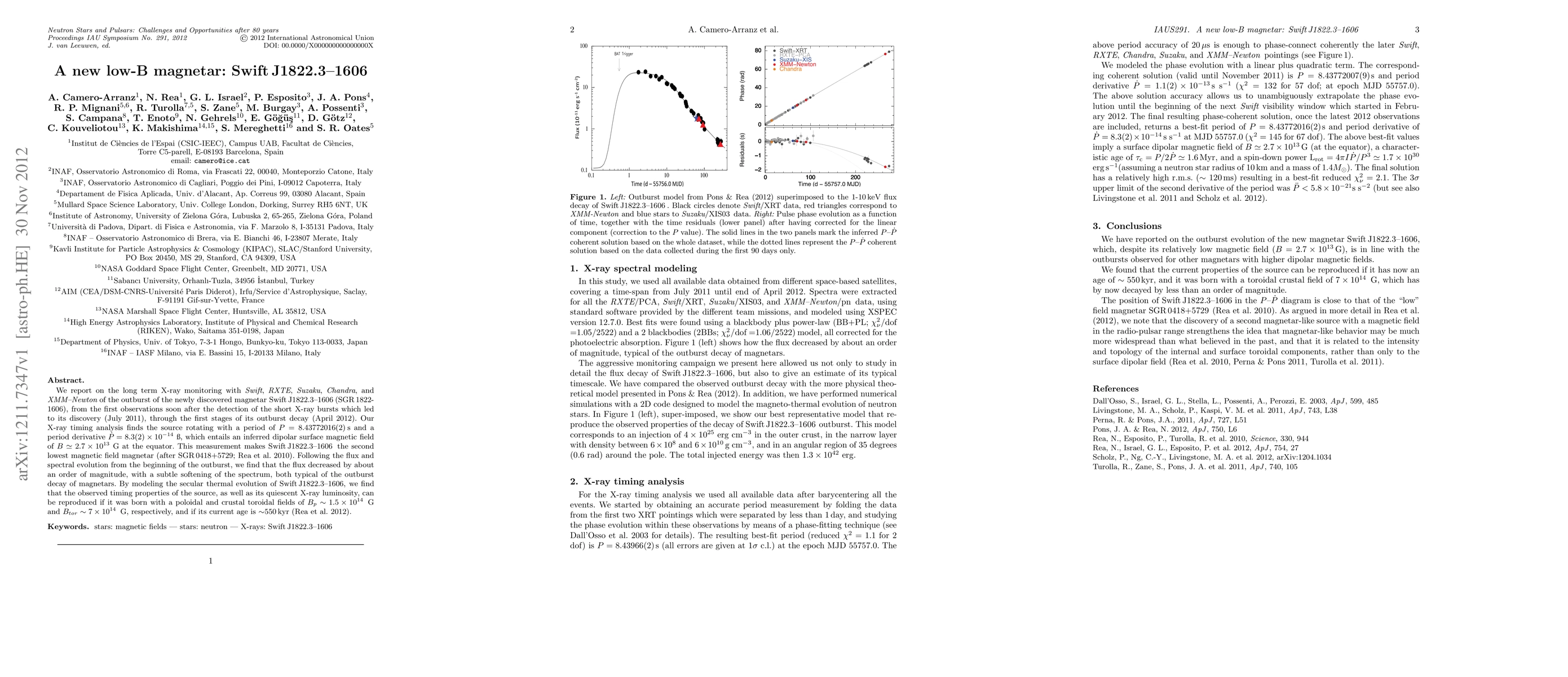 This paper reports long-term X-ray monitoring of the magnetar Swift J1822.3-1606, revealing a rotation period of 8.44 seconds and a magnetic field of 2.7 x 10^13 G, making it the second lowest magnetic field magnetar. The study observes a flux decrease and spectral softening typical of magnetar outburst decay, suggesting an age of ~550 kyr.