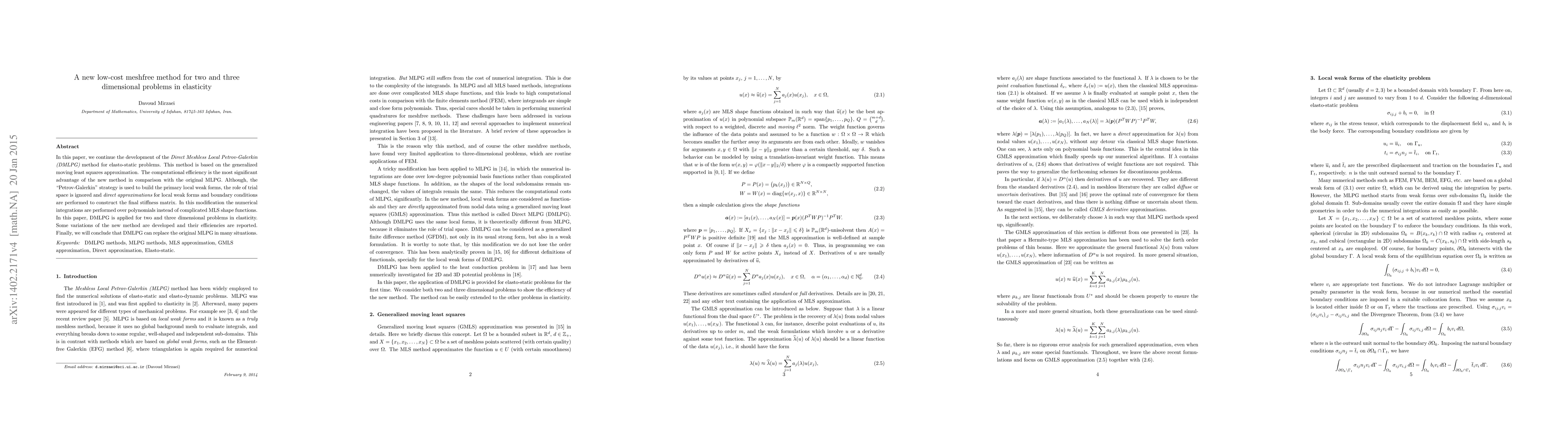 This paper introduces a new low-cost meshfree method called Direct Meshless Local Petrov-Galerkin (DMLPG) for solving two and three-dimensional elasticity problems. The method enhances computational efficiency by using direct approximations and polynomial integrations instead of complex MLS shape functions, thus potentially replacing the original Meshless Local Petrov-Galerkin (MLPG) method in many applications.