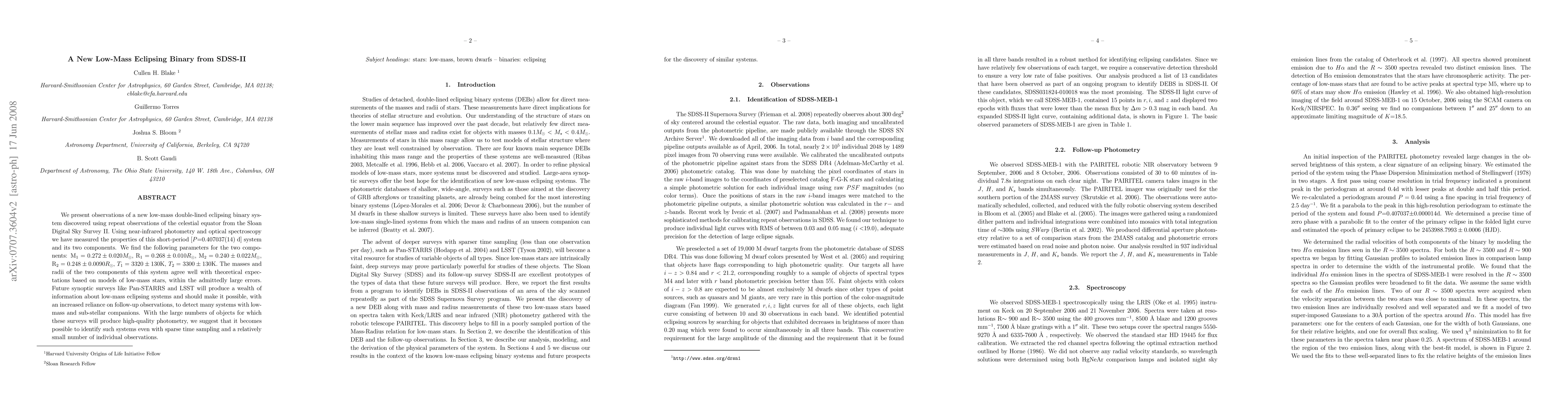 We present observations of a new low-mass double-lined eclipsing binary system discovered using repeat observations of the celestial equator from the Sloan Digital Sky Survey II. Using near-infrared photometry and optical spectroscopy we have measured the properties of this short-period [P=0.407037(14) d] system and its two components. We find the following parameters for the two components: M_1=0.272+/-0.020 M_sun, R_1=0.268+/-0.010 R_sun, M_2=0.240+/-0.022 M_sun, R_2=0.248+/-0.0090 R_sun, T_1=3320+/-130 K, T_2=3300+/-130 K. The masses and radii of the two components of this system agree well with theoretical expectations based on models of low-mass stars, within the admittedly large errors. Future synoptic surveys like Pan-STARRS and LSST will produce a wealth of information about low-mass eclipsing systems and should make it possible, with an increased reliance on follow-up observations, to detect many systems with low-mass and sub-stellar companions. With the large numbers of objects for which these surveys will produce high-quality photometry, we suggest that it becomes possible to identify such systems even with sparse time sampling and a relatively small number of individual observations.