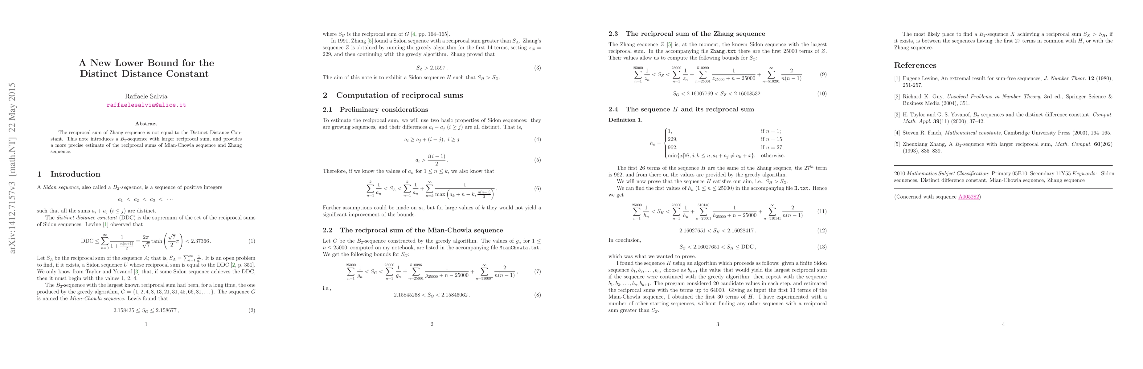 The reciprocal sum of Zhang sequence is not equal to the Distinct Distance Constant. This note introduces a $B_2$-sequence with larger reciprocal sum, and provides a more precise estimation of the reciprocal sums of Mian-Chowla sequence and Zhang sequence.