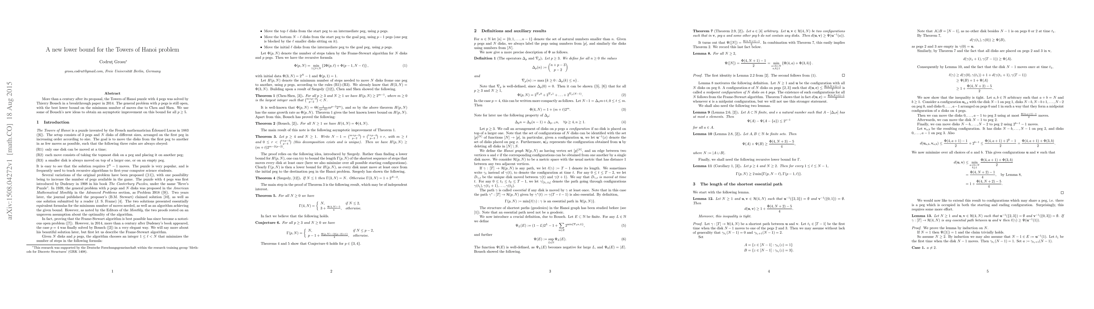 More than a century after its proposal, the Towers of Hanoi puzzle with 4 pegs was solved by Thierry Bousch in a breakthrough paper in 2014. The general problem with p pegs is still open, with the best lower bound on the minimum number of moves due to Chen and Shen. We use some of Bousch's new ideas to obtain an asymptotic improvement on this bound for all p >= 5.