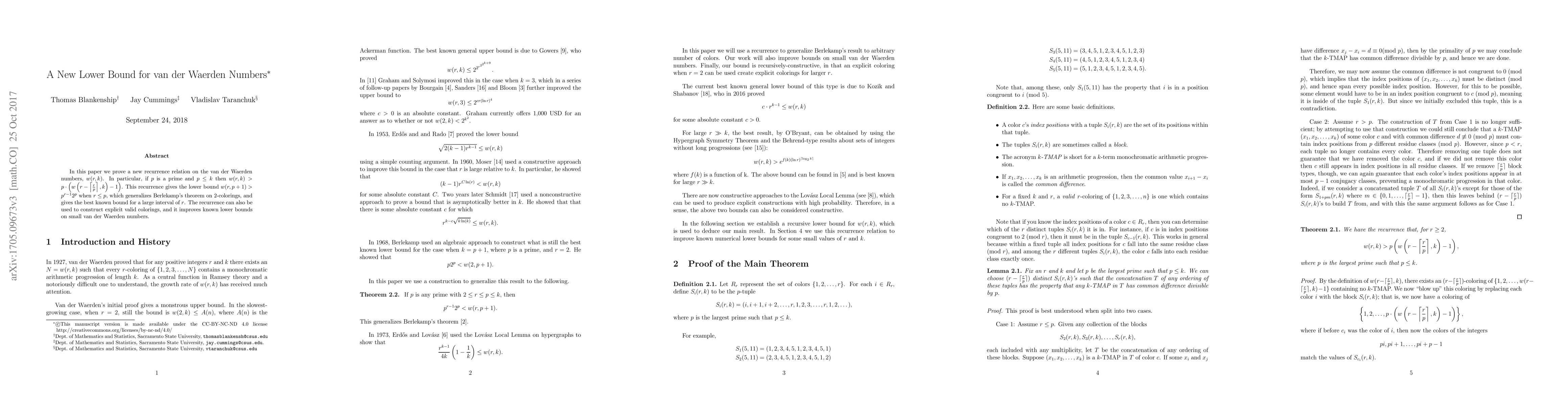 In this paper we prove a new recurrence relation on the van der Waerden numbers, $w(r,k)$. In particular, if $p$ is a prime and $p\leq k$ then $w(r, k) > p \cdot \left(w\left(r - \left\lceil \frac{r}{p}\right\rceil, k\right) -1\right)$. This recurrence gives the lower bound $w(r, p+1) > p^{r-1}2^p$ when $r \leq p$, which generalizes Berlekamp's theorem on 2-colorings, and gives the best known bound for a large interval of $r$. The recurrence can also be used to construct explicit valid colorings, and it improves known lower bounds on small van der Waerden numbers.