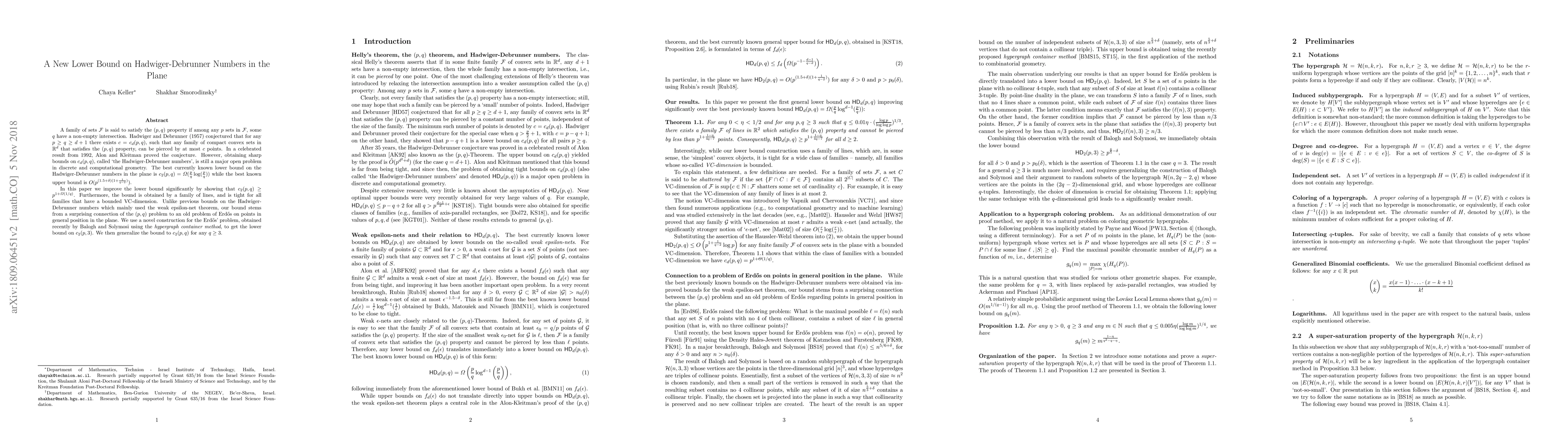 This paper improves the lower bound on the Hadwiger-Debrunner numbers in the plane, showing that $c_2(p,q) \geq p^{1+\Omega(1/q)}$. The authors achieve this by leveraging a novel construction related to an Erdős problem on points in general position, using the hypergraph container method.