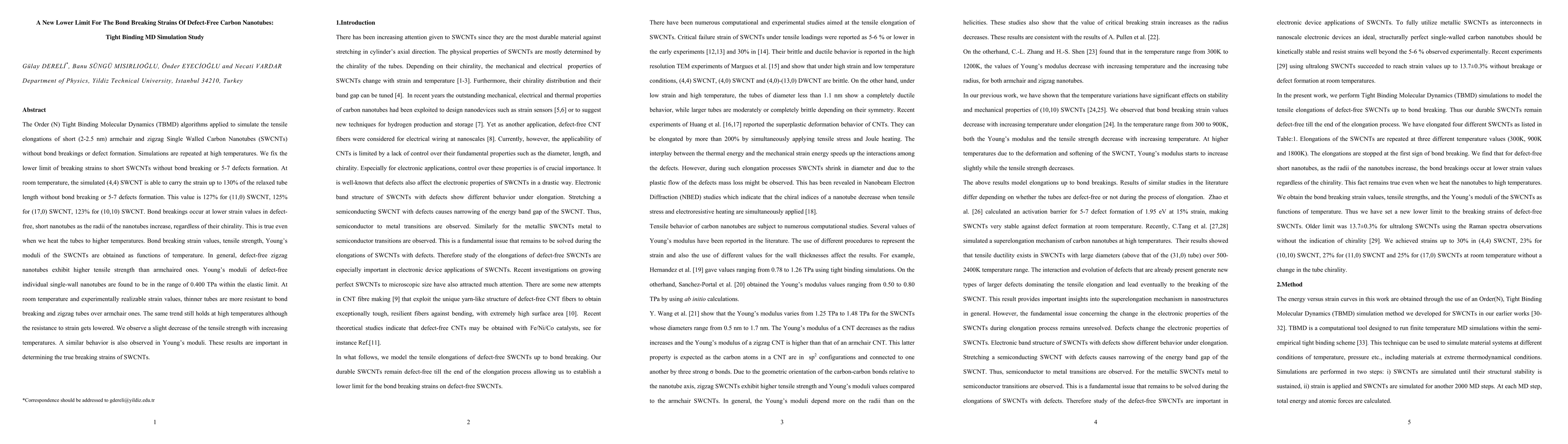 This study uses Tight Binding Molecular Dynamics simulations to determine the lower limit of bond breaking strains in defect-free short single-walled carbon nanotubes (SWCNTs). The simulations reveal that at room temperature, defect-free armchair and zigzag SWCNTs can withstand strains up to 130% without breaking, with zigzag nanotubes showing higher tensile strength than armchair ones.