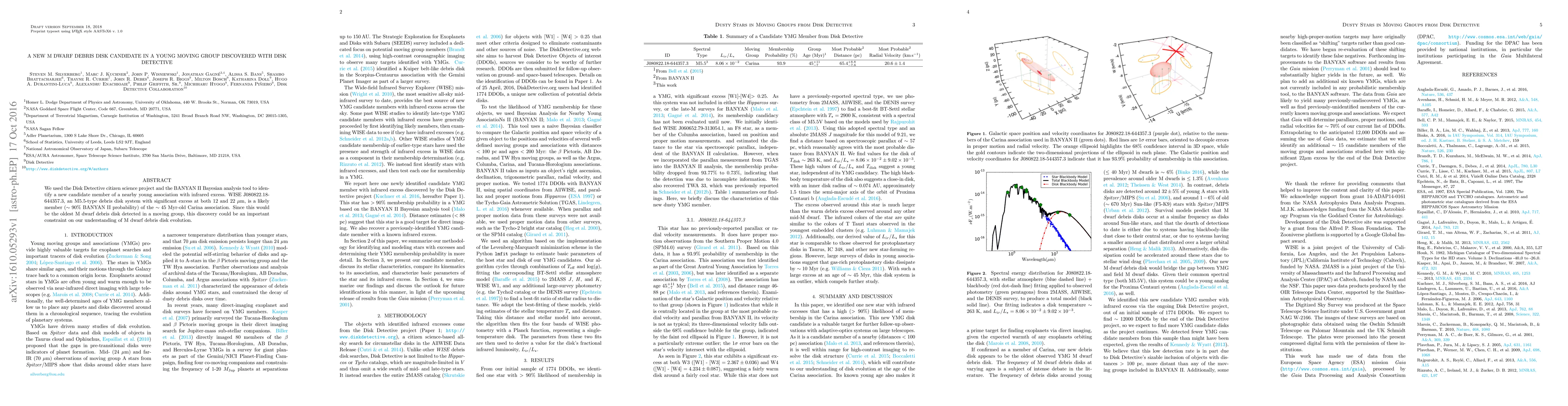 This paper identifies a new M5.5-type debris disk candidate, WISE J080822.18-644357.3, using the Disk Detective project and BANYAN II tool, likely belonging to the 45 Myr-old Carina association. This discovery could provide significant insights into the evolution of debris disks around M dwarfs.