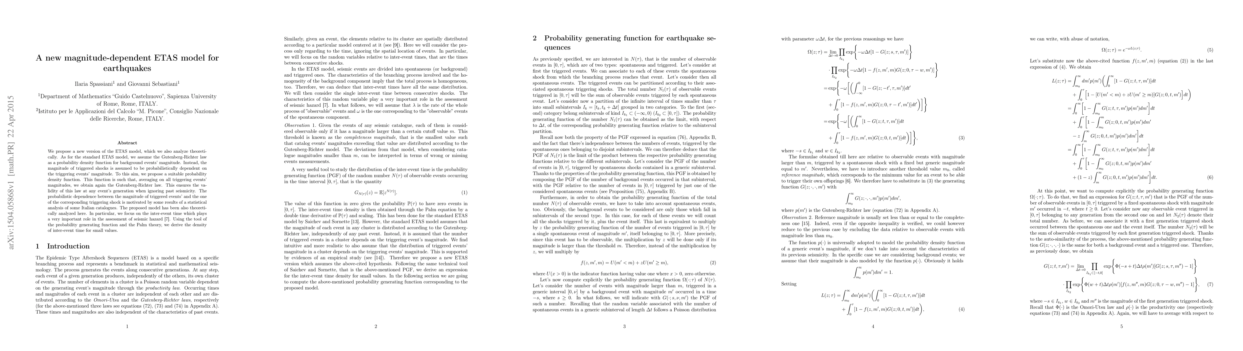 We propose a new version of the ETAS model, which we also analyze theoretically. As for the standard ETAS model, we assume the Gutenberg-Richter law as a probability density function for background events' magnitude. Instead, the magnitude of triggered shocks is assumed to be probabilistically dependent on the triggering events' magnitude. To this aim, we propose a suitable probability density function. This function is such that, averaging on all triggering events' magnitudes, we obtain again the Gutenberg-Richter law. This ensures the validity of this law at any event's generation when ignoring past seismicity. The probabilistic dependence between the magnitude of triggered events' and the one of the corresponding triggering shock is motivated by some results of a statistical analysis of some Italian catalogues. The proposed model has been also theoretically analyzed here. In particular, we focus on the inter-event time which plays a very important role in the assessment of seismic hazard. Using the tool of the probability generating function and the Palm theory, we derive the density of inter-event time for small values.