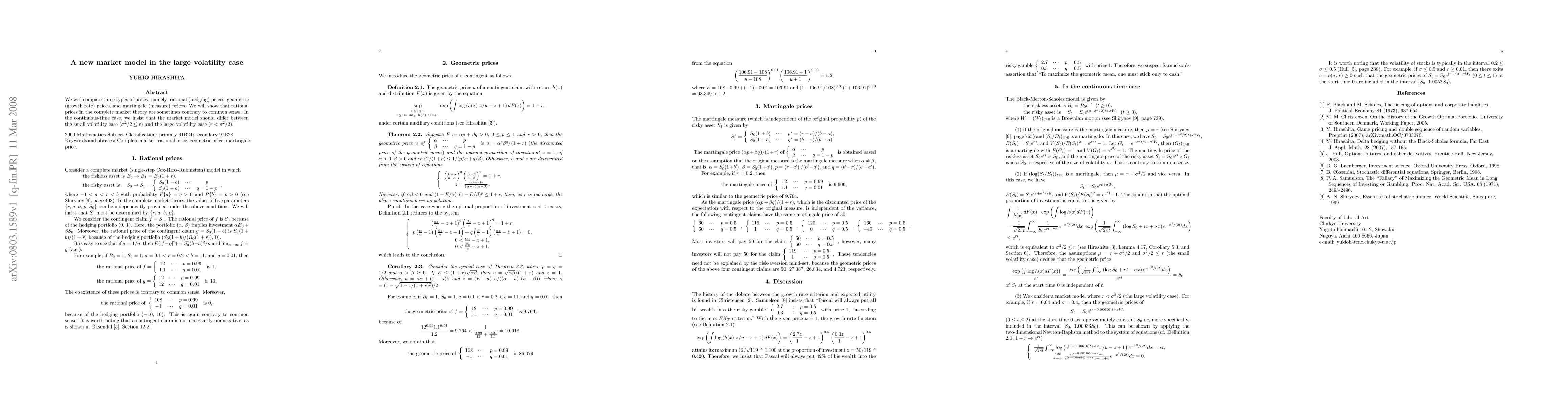 A new market model compares three types of prices in a large volatility case, highlighting discrepancies between rational prices and common sense, and emphasizing the need for distinct models for small and large volatility cases.