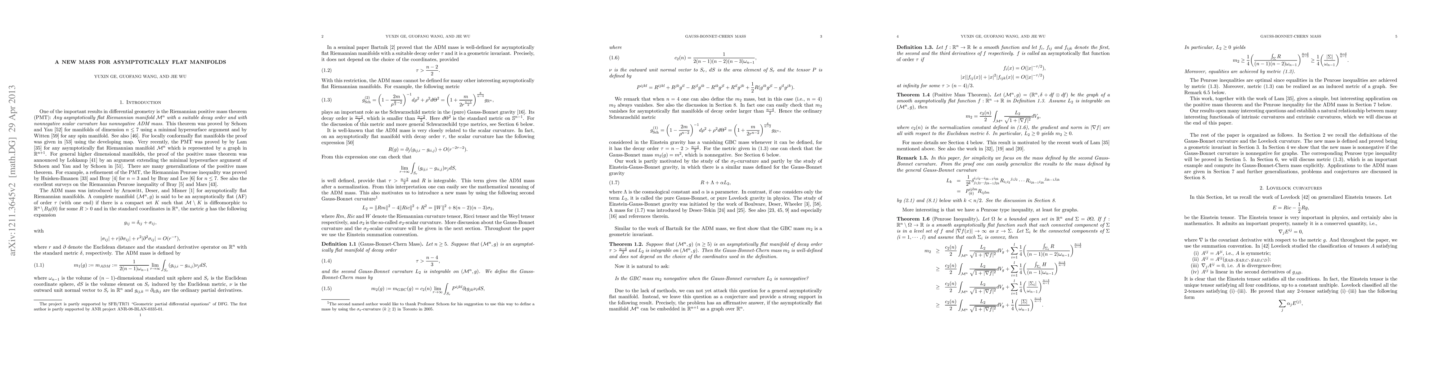 Researchers introduce a new mass concept for asymptotically flat manifolds using Gauss-Bonnet curvature, proving its existence under specific conditions and deriving positive mass theorems and Penrose inequalities.