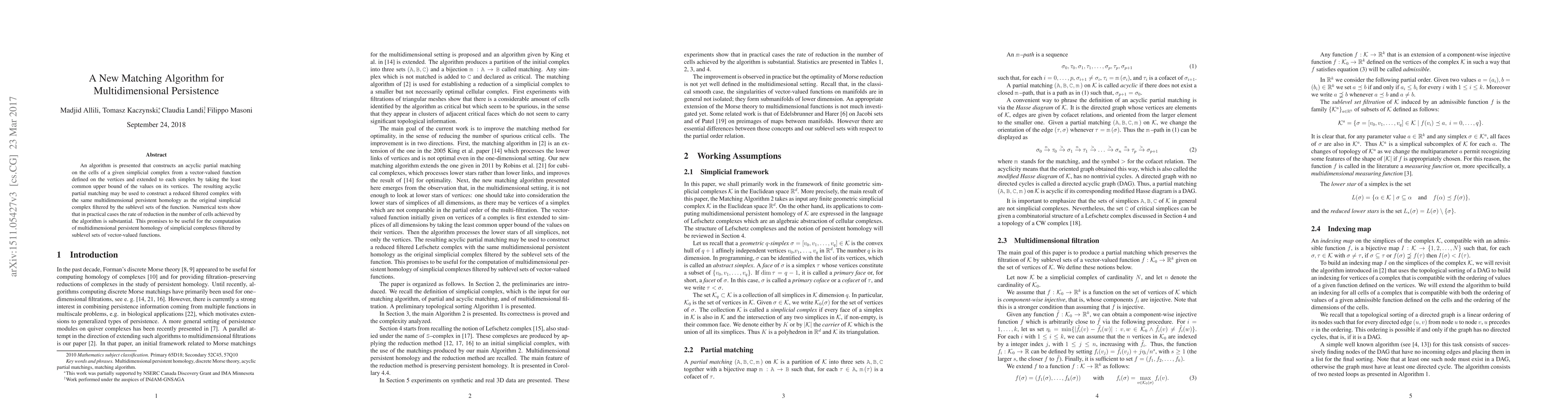An algorithm is presented that constructs an acyclic partial matching on the cells of a given simplicial complex from a vector-valued function defined on the vertices and extended to each simplex by taking the least common upper bound of the values on its vertices. The resulting acyclic partial matching may be used to construct a reduced filtered complex with the same multidimensional persistent homology as the original simplicial complex filtered by the sublevel sets of the function. Numerical tests show that in practical cases the rate of reduction in the number of cells achieved by the algorithm is substantial. This promises to be useful for the computation of multidimensional persistent homology of simplicial complexes filtered by sublevel sets of vector-valued functions.
