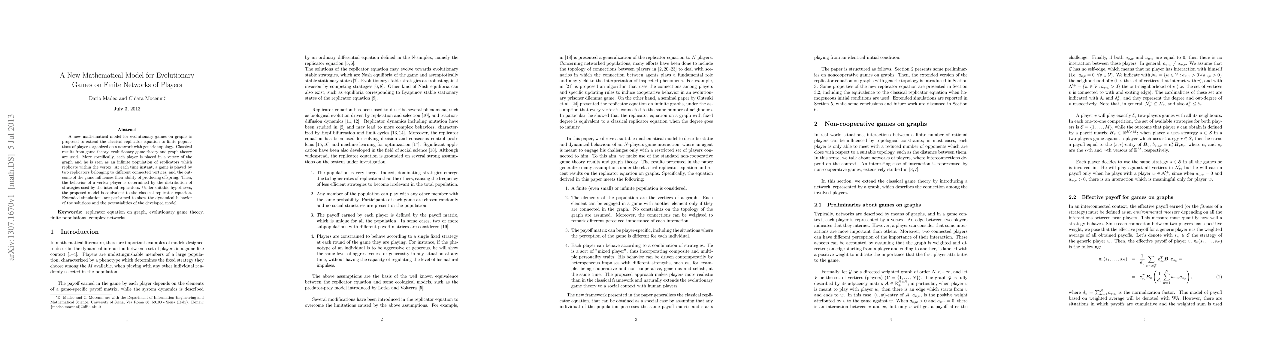 A new mathematical model for evolutionary games on graphs is proposed to extend the classical replicator equation to finite populations of players organized on a network with generic topology. Classical results from game theory, evolutionary game theory and graph theory are used. More specifically, each player is placed in a vertex of the graph and he is seen as an infinite population of replicators which replicate within the vertex. At each time instant, a game is played by two replicators belonging to different connected vertices, and the outcome of the game influences their ability of producing offspring. Then, the behavior of a vertex player is determined by the distribution of strategies used by the internal replicators. Under suitable hypotheses, the proposed model is equivalent to the classical replicator equation. Extended simulations are performed to show the dynamical behavior of the solutions and the potentialities of the developed model.