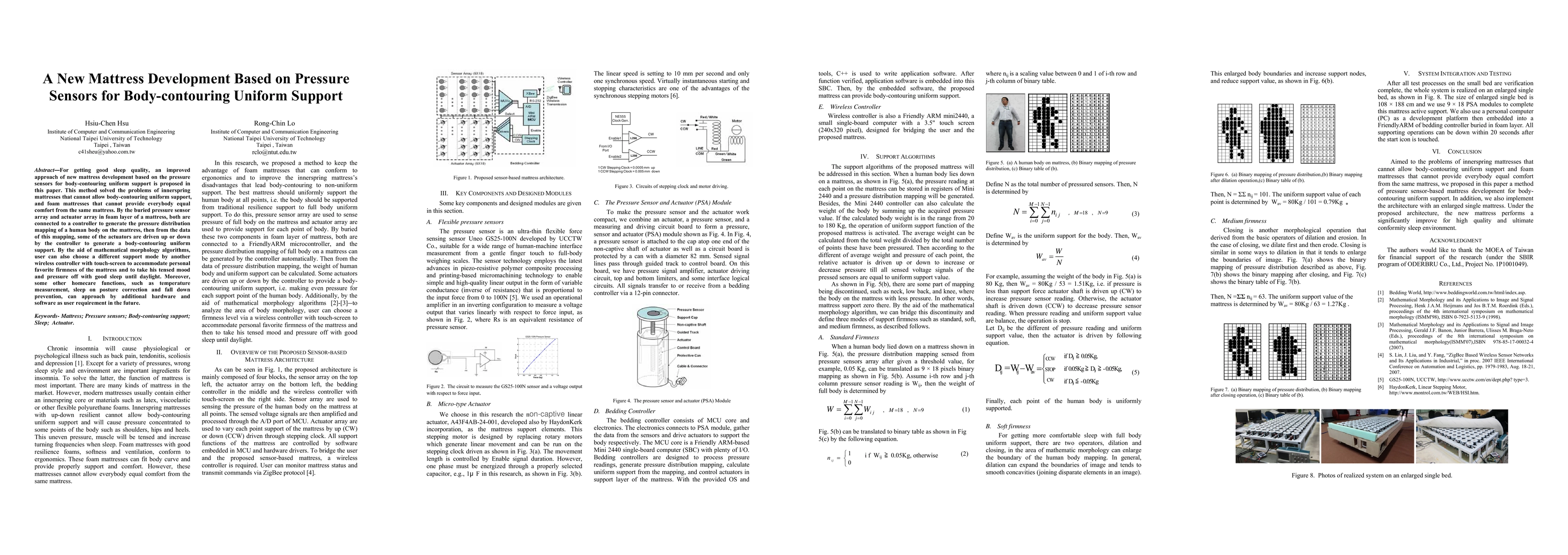 For getting good sleep quality, an improved approach of new mattress development based on the pressure sensors for body-contouring uniform support is proposed in this paper. This method solved the problems of innerspring mattresses that cannot allow body-contouring uniform support, and foam mattresses that cannot provide everybody equal comfort from the same mattress. By the buried pressure sensor array and actuator array in foam layer of a mattress, both are connected to a controller to generate the pressure distribution mapping of a human body on the mattress, then from the data of this mapping, some of the actuators are driven up or down by the controller to generate a body-contouring uniform support. By the aid of mathematical morphology algorithms, user can also choose a different support mode by another wireless controller with touch-screen to accommodate personal favorite firmness of the mattress and to take his tensed mood and pressure off with good sleep until daylight. Moreover, some other homecare functions, such as temperature measurement, sleep on posture correction and fall down prevention, can approach by additional hardware and software as user requirement in the future.