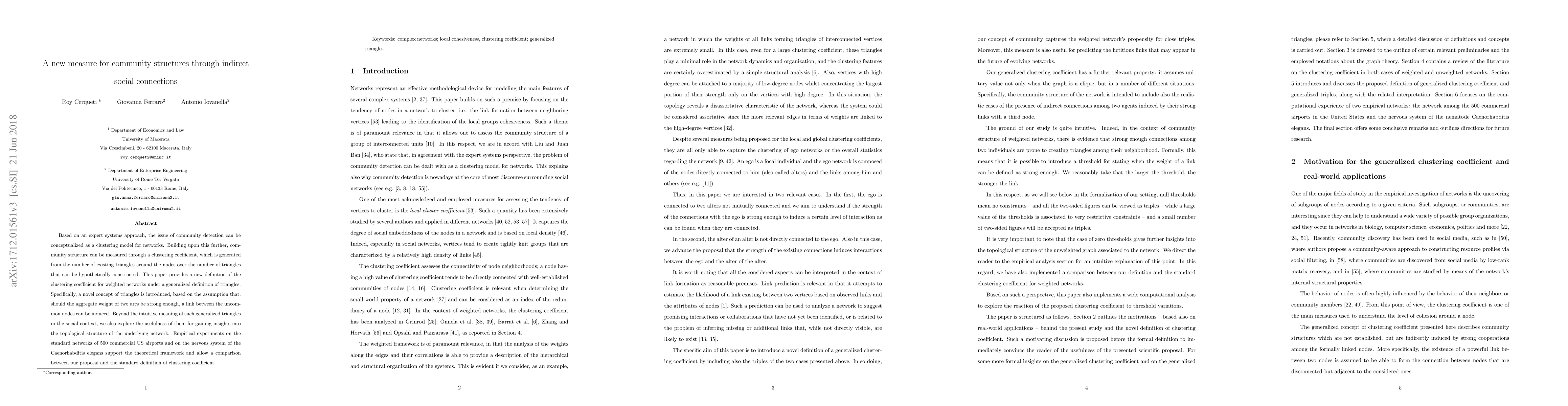 This paper introduces a novel clustering coefficient for measuring community structures in networks, utilizing generalized triangles based on arc weights. Empirical tests on US airports and C. elegans nervous system networks validate the approach, offering insights into network topology.