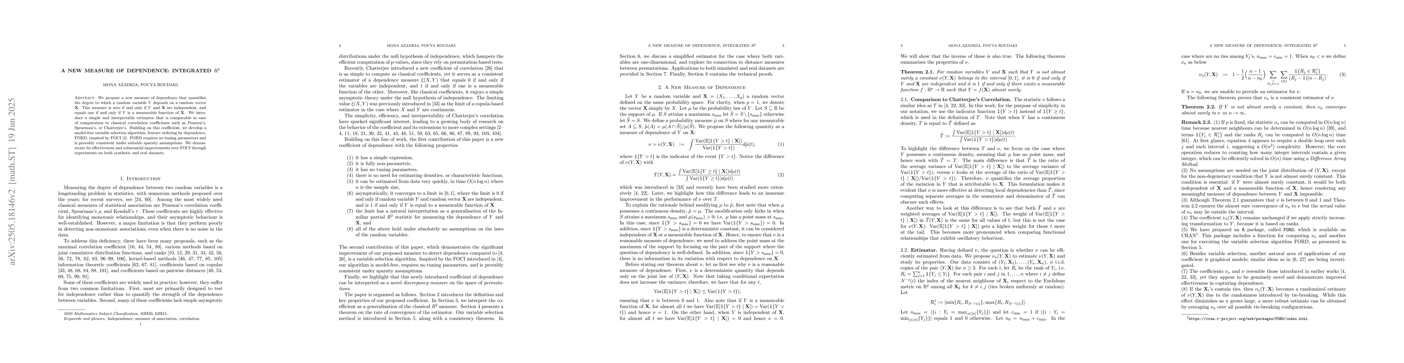 The research introduces a new measure of dependence called Integrated $R^2$, which quantifies the dependence of a random variable $Y$ on a random vector $X$. It also presents a simple estimator for this measure and a model-free variable selection algorithm, FORD, derived from it.