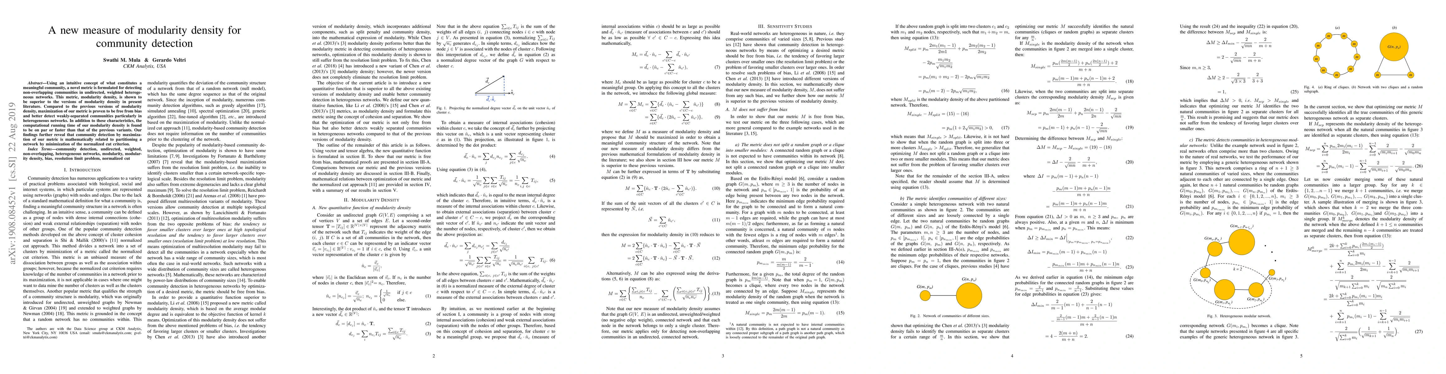 A new metric called modularity density is formulated for detecting non-overlapping communities in undirected, weighted heterogeneous networks, based on the concept of meaningful communities.