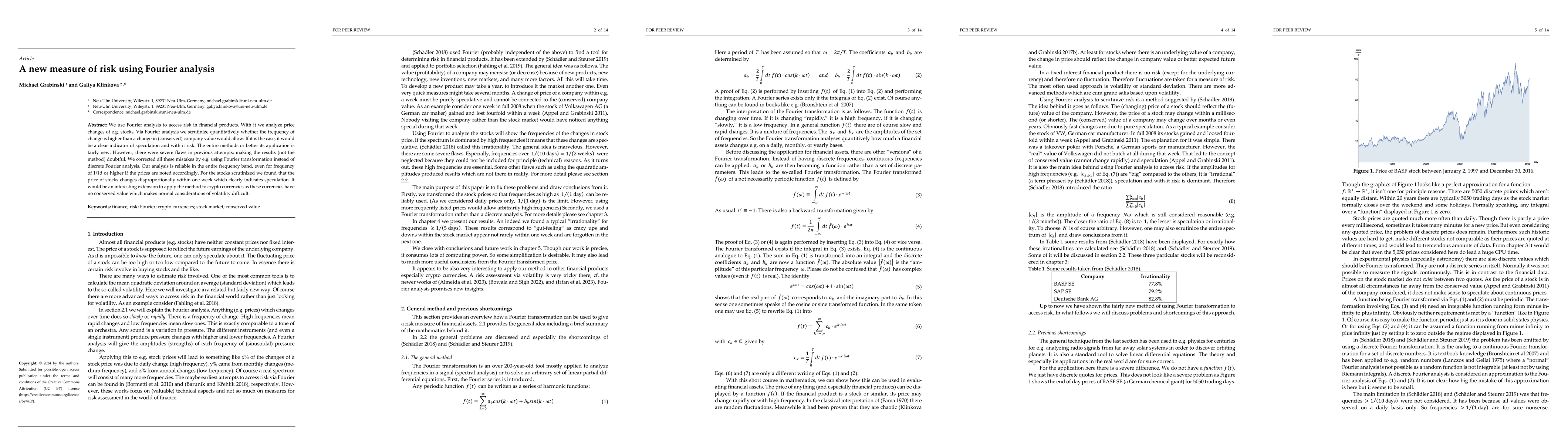 We use Fourier analysis to access risk in financial products. With it we analyze price changes of e.g. stocks. Via Fourier analysis we scrutinize quantitatively whether the frequency of change is higher than a change in (conserved) company value would allow. If it is the case, it would be a clear indicator of speculation and with it risk. The entire methods or better its application is fairly new. However, there were severe flaws in previous attempts; making the results (not the method) doubtful. We corrected all these mistakes by e.g. using Fourier transformation instead of discrete Fourier analysis. Our analysis is reliable in the entire frequency band, even for fre-quency of 1/1d or higher if the prices are noted accordingly. For the stocks scrutinized we found that the price of stocks changes disproportionally within one week which clearly indicates spec-ulation. It would be an interesting extension to apply the method to crypto currencies as these currencies have no conserved value which makes normal considerations of volatility difficult.