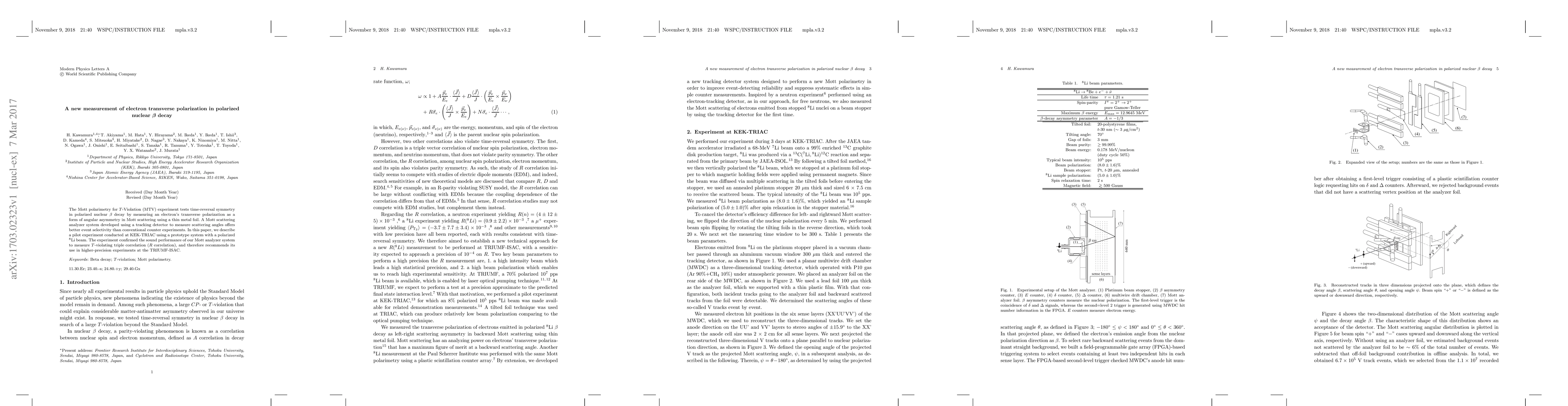 The Mott polarimetry for T -Violation (MTV) experiment tests time-reversal symmetry in polarized nuclear beta decay by measuring an electron's transverse polarization as a form of angular asymmetry in Mott scattering using a thin metal foil. A Mott scattering analyzer system developed using a tracking detector to measure scattering angles offers better event selectivity than conventional counter experiments. In this paper, we describe a pilot experiment conducted at KEK-TRIAC using a prototype system with a polarized 8Li beam. The experiment confirmed the sound performance of our Mott analyzer system to measure T-violating triple correlation (R correlation), and therefore recommends its use in higher-precision experiments at the TRIUMF-ISAC.