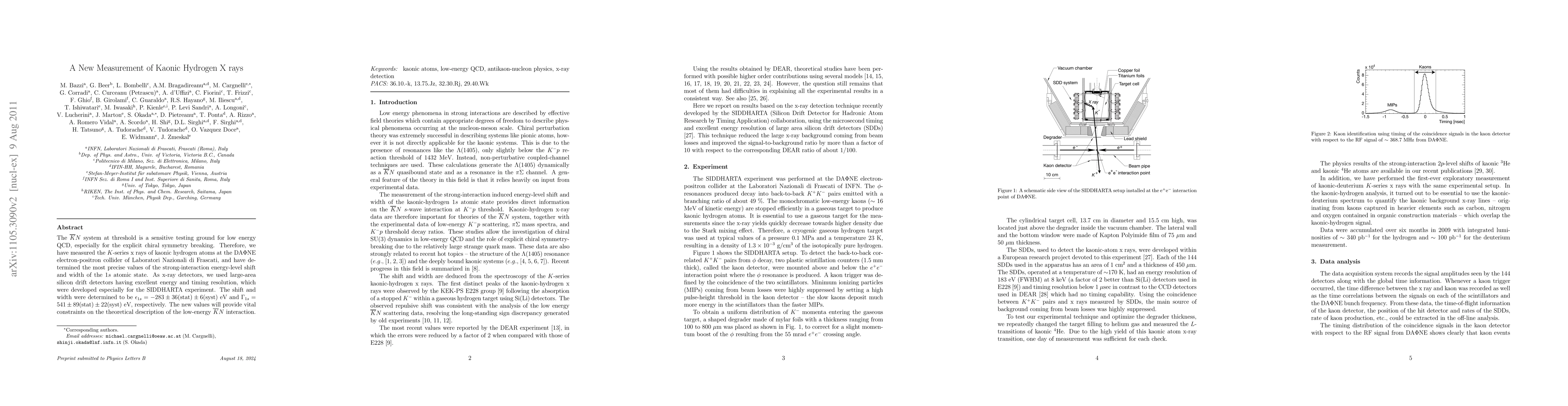 The $\bar{K}N$ system at threshold is a sensitive testing ground for low energy QCD, especially for the explicit chiral symmetry breaking. Therefore, we have measured the $K$-series x rays of kaonic hydrogen atoms at the DA$\Phi$NE electron-positron collider of Laboratori Nazionali di Frascati, and have determined the most precise values of the strong-interaction energy-level shift and width of the $1s$ atomic state. As x-ray detectors, we used large-area silicon drift detectors having excellent energy and timing resolution, which were developed especially for the SIDDHARTA experiment. The shift and width were determined to be $\epsilon_{1s} = -283 \pm 36 \pm 6 {(syst)}$ eV and $\Gamma_{1s} = 541 \pm 89 {(stat)} \pm 22 {(syst)}$ eV, respectively. The new values will provide vital constraints on the theoretical description of the low-energy $\bar{K}N$ interaction.