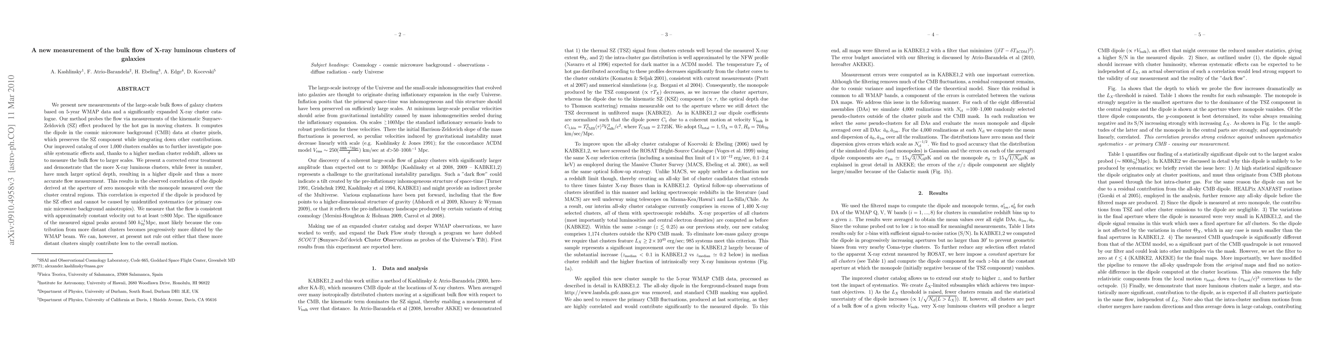 We present new measurements of the large-scale bulk flows of galaxy clusters based on 5-year WMAP data and a significantly expanded X-ray cluster catalogue. Our method probes the flow via measurements of the kinematic Sunyaev-Zeldovich (SZ) effect produced by the hot gas in moving clusters. It computes the dipole in the cosmic microwave background (CMB) data at cluster pixels, which preserves the SZ component while integrating down other contributions. Our improved catalog of over 1,000 clusters enables us to further investigate possible systematic effects and, thanks to a higher median cluster redshift, allows us to measure the bulk flow to larger scales. We present a corrected error treatment and demonstrate that the more X-ray luminous clusters, while fewer in number, have much larger optical depth, resulting in a higher dipole and thus a more accurate flow measurement. This results in the observed correlation of the dipole derived at the aperture of zero monopole with the monopole measured over the cluster central regions. This correlation is expected if the dipole is produced by the SZ effect and cannot be caused by unidentified systematics (or primary cosmic microwave background anisotropies). We measure that the flow is consistent with approximately constant velocity out to at least 800 Mpc. The significance of the measured signal peaks around 500 Mpc, most likely because the contribution from more distant clusters becomes progressively more diluted by the WMAP beam. We can, however, at present not rule out that these more distant clusters simply contribute less to the overall motion.