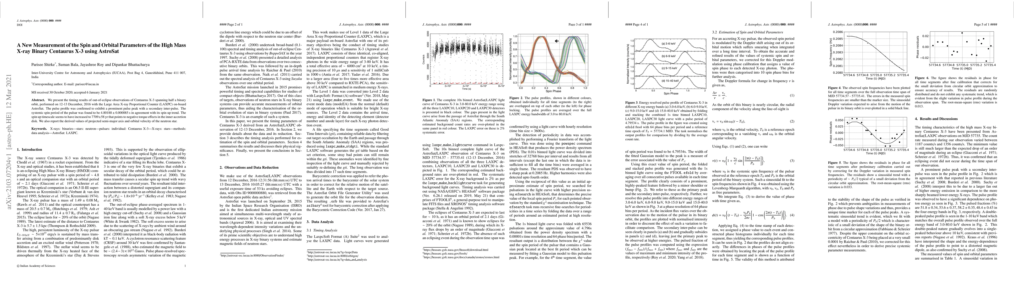 We present the timing results of out-of-eclipse observations of Centaurus X-3 spanning half a binary orbit, performed on 12-13 December, 2016 with the Large Area X-ray Proportional Counter (LAXPC) on-board AstroSat. The pulse profile was confirmed to exhibit a prominent pulse peak with a secondary inter-pulse. The systemic spin period of the pulsar was found to be $4.80188 \pm 0.000085$ s in agreement with its spin up trend. The spin up timescale seems to have increased to $7709 \pm 58$ yr that points to negative torque effects in the inner accretion disk. We also report the derived values of projected semi-major axis and orbital velocity of the neutron star.