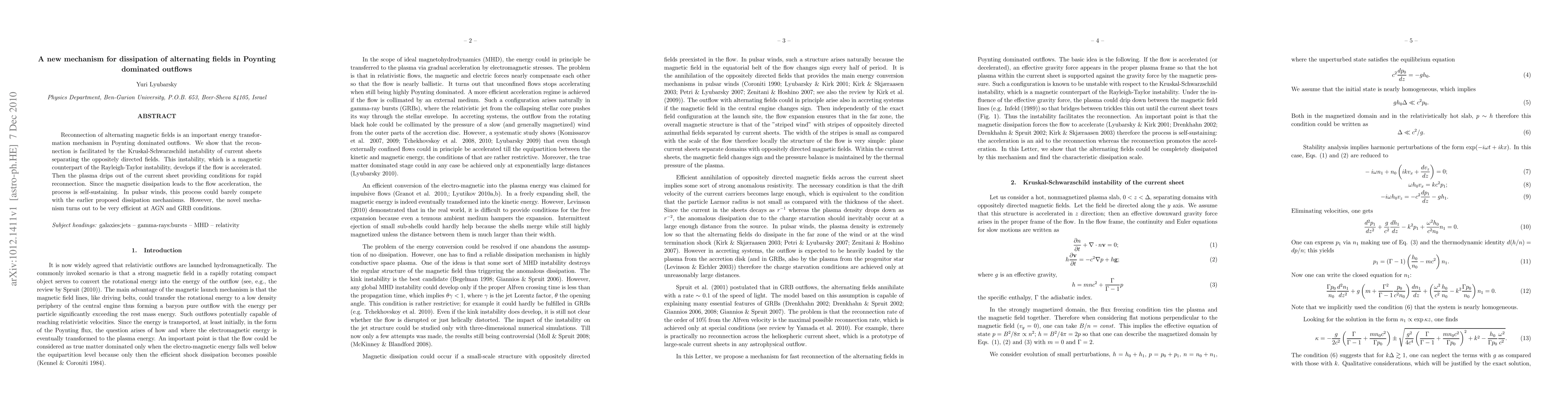 Reconnection of alternating magnetic fields is an important energy transformation mechanism in Poynting dominated outflows. We show that the reconnection is facilitated by the Kruskal-Schwarzschild instability of current sheets separating the oppositely directed fields. This instability, which is a magnetic counterpart of the Rayleigh-Taylor instability, develops if the flow is accelerated. Then the plasma drips out of the current sheet providing conditions for rapid reconnection. Since the magnetic dissipation leads to the flow acceleration, the process is self-sustaining. In pulsar winds, this process could barely compete with the earlier proposed dissipation mechanisms. However, the novel mechanism turns out to be very efficient at AGN and GRB conditions.