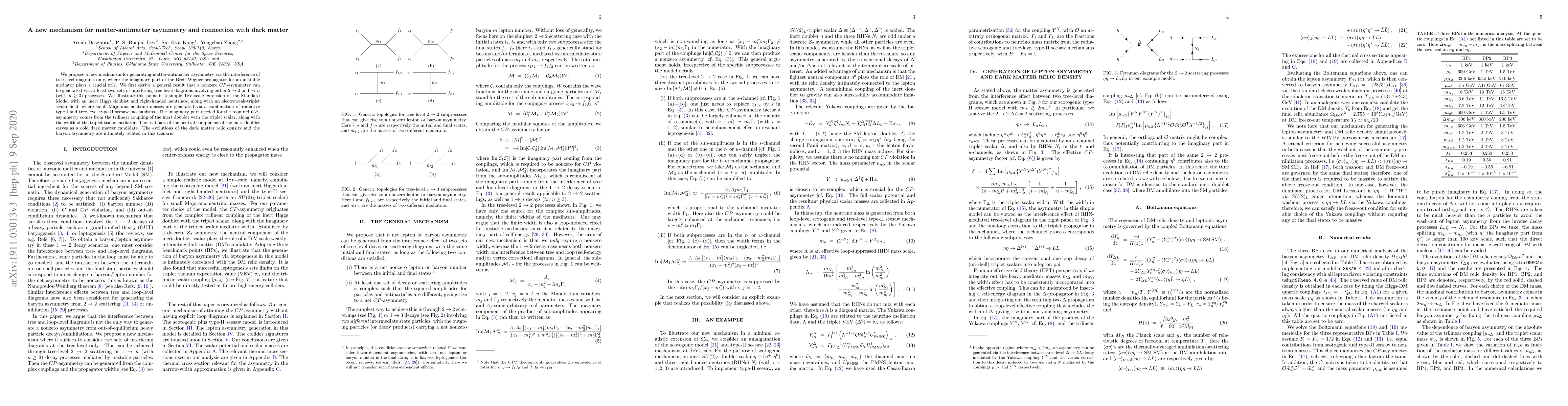 This paper proposes a novel mechanism for generating matter-antimatter asymmetry through the interference of tree-level diagrams, emphasizing the role of the imaginary part of the Breit-Wigner propagator. It connects this asymmetry with dark matter in a TeV-scale model featuring an inert Higgs doublet, right-handed neutrinos, and an electroweak-triplet scalar, where dark matter is the real part of the inert doublet.