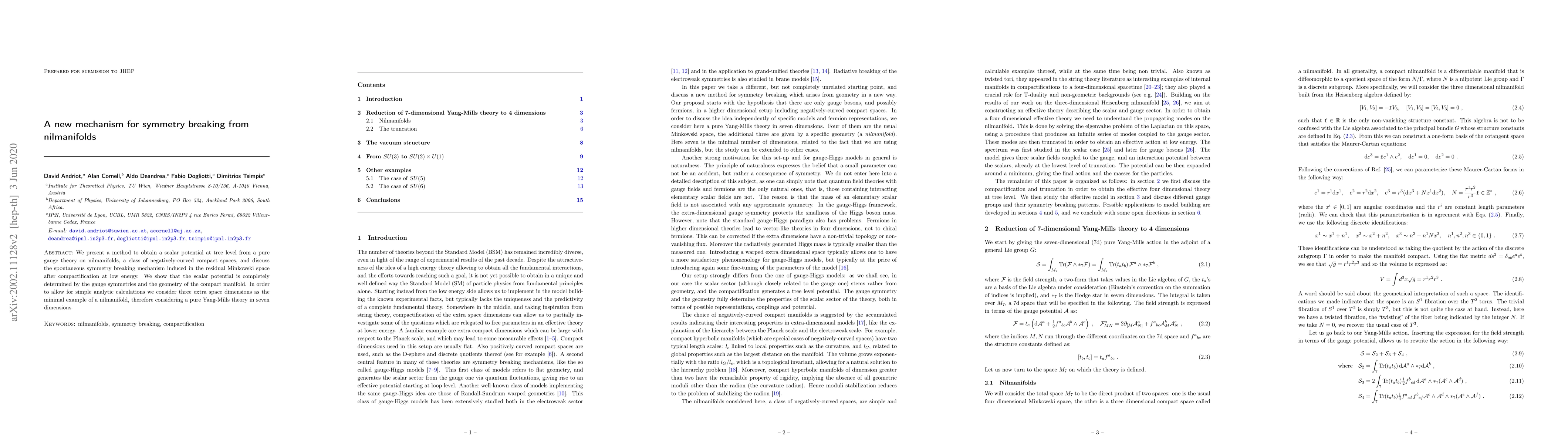 We present a method to obtain a scalar potential at tree level from a pure gauge theory on nilmanifolds, a class of negatively-curved compact spaces, and discuss the spontaneous symmetry breaking mechanism induced in the residual Minkowski space after compactification at low energy. We show that the scalar potential is completely determined by the gauge symmetries and the geometry of the compact manifold. In order to allow for simple analytic calculations we consider three extra space dimensions as the minimal example of a nilmanifold, therefore considering a pure Yang-Mills theory in seven dimensions.