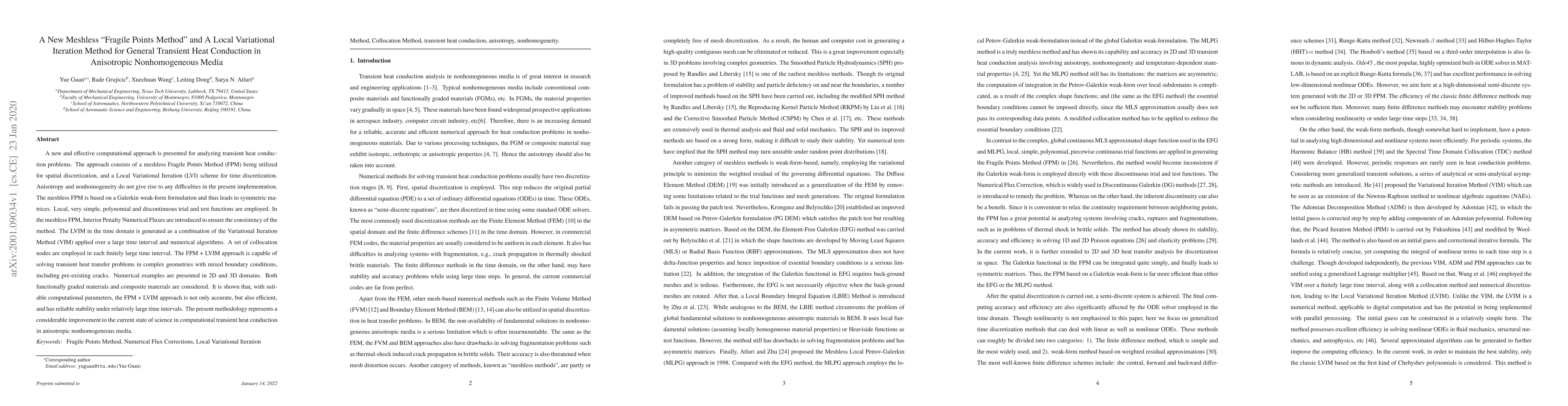 This paper introduces a meshless Fragile Points Method (FPM) for spatial discretization and a Local Variational Iteration Method (LVIM) for time discretization to solve transient heat conduction in anisotropic nonhomogeneous media. The FPM uses simple polynomial trial and test functions, and the LVIM combines variational iteration with numerical algorithms, demonstrating accuracy, efficiency, and stability for complex geometries and materials.