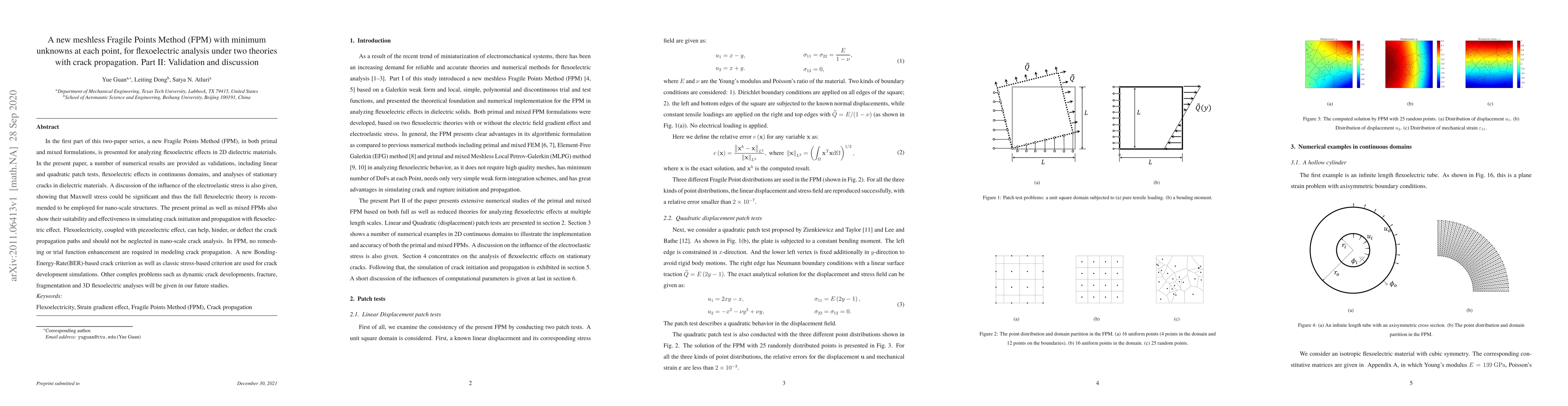 This paper validates a new Meshless Fragile Points Method (FPM) for flexoelectric analysis in 2D dielectric materials, demonstrating its effectiveness through various numerical tests and crack propagation simulations. The study highlights the significance of Maxwell stress in nano-scale structures and the necessity of employing full flexoelectric theory, while showing that FPM can effectively model crack initiation and propagation without remeshing.
