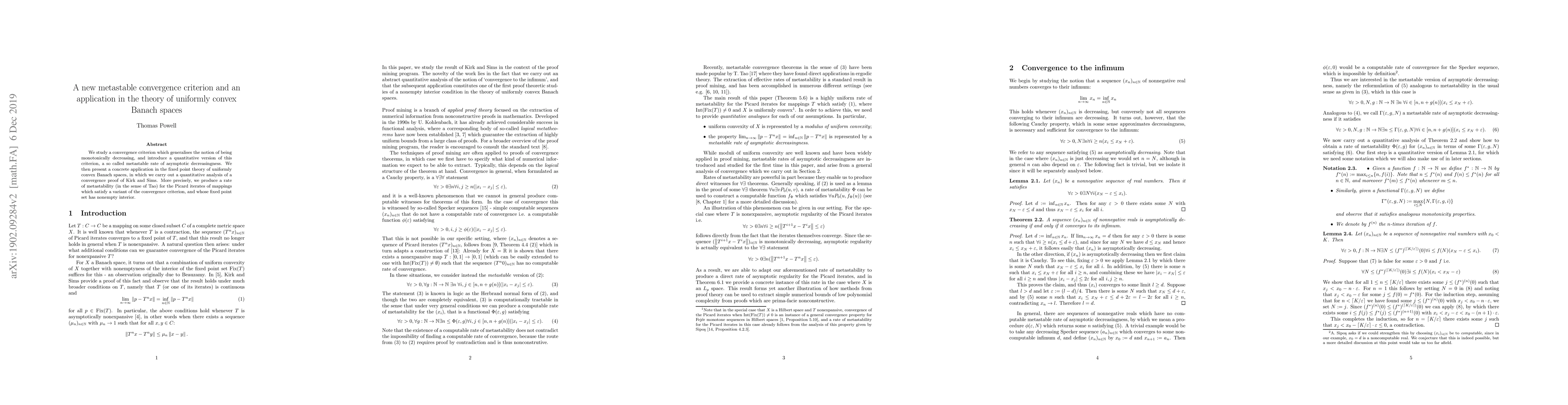 We study a convergence criterion which generalises the notion of being monotonically decreasing, and introduce a quantitative version of this criterion, a so called metastable rate of asymptotic decreasingness. We then present a concrete application in the fixed point theory of uniformly convex Banach spaces, in which we carry out a quantitative analysis of a convergence proof of Kirk and Sims. More precisely, we produce a rate of metastability (in the sense of Tao) for the Picard iterates of mappings T which satisfy a variant of the convergence criterion, and whose fixed point set has nonempty interior.