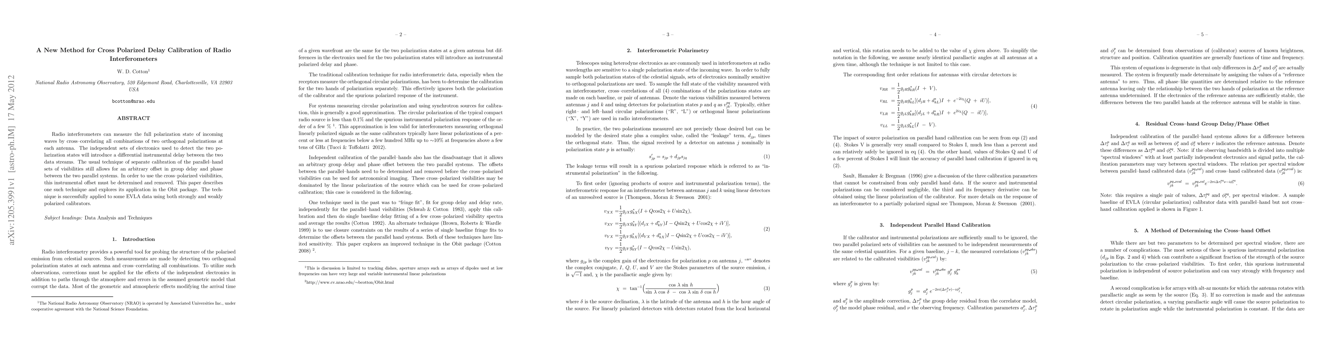 Radio interferometers can measure the full polarization state of incoming waves by cross--correlating all combinations of two orthogonal polarizations at each antenna. The independent sets of electronics used to detect the two polarization states will introduce a differential instrumental delay between the two data streams. The usual technique of separate calibration of the parallel--hand sets of visibilities still allows for an arbitrary offset in group delay and phase between the two parallel systems. In order to use the cross--polarized visibilities, this instrumental offset must be determined and removed. This paper describes one such technique and explores its application in the Obit package. The technique is successfully applied to some EVLA data using both strongly and weakly polarized calibrators.