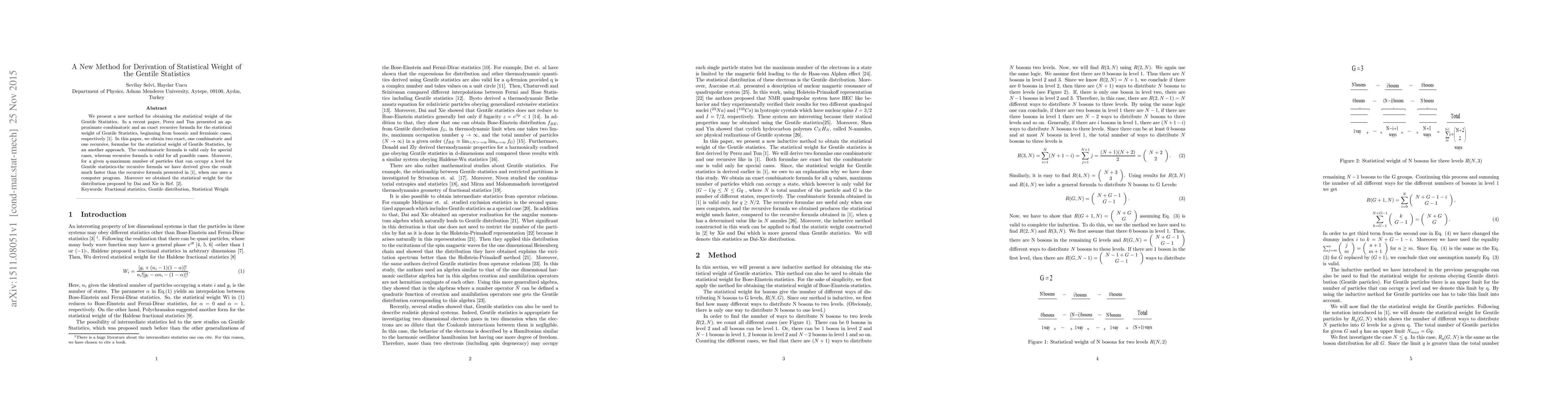 We present a new method for obtaining the statistical weight of the Gentile Statistics. In a recent paper, Perez and Tun presented an ap- proximate combinatoric and an exact recursive formula for the statistical weight of Gentile Statistics, beginning from bosonic and fermionic cases, respectively [1]. In this paper, we obtain two exact, one combinatoric and one recursive, formulae for the statistical weight of Gentile Statistics, by an another approach. The combinatoric formula is valid only for special cases, whereas recursive formula is valid for all possible cases. Moreover, for a given q-maximum number of particles that can occupy a level for Gentile statistics-the recursive formula we have derived gives the result much faster than the recursive formula presented in [1], when one uses a computer program. Moreover we obtained the statistical weight for the distribution proposed by Dai and Xie in Ref. [2]. Keywords: Fractional statistics, Gentile distribution, Statistical Weight