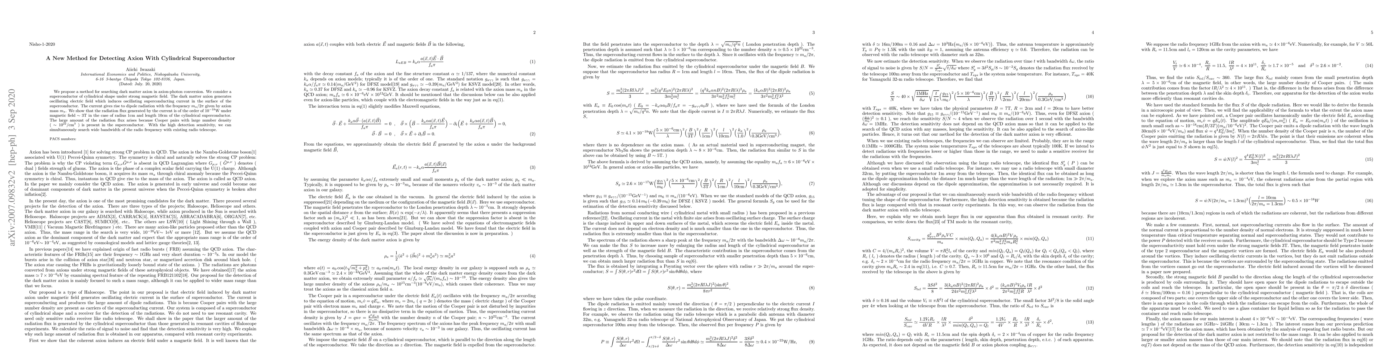 We propose a method for searching dark matter axion in axion-photon conversion. We consider a superconductor of cylindrical shape under strong magnetic field. The dark matter axion generates oscillating electric field which induces oscillating superconducting current in the surface of the superconductor. The current gives rise to dipole radiation with the frequency $m_a/2\pi$ given by axion mass $m_a$. We show that the radiation flux generated by the current is of the order of $10^{-18}$W under magnetic field $\sim 3$T in the case of radius $\sim 1$cm and length $\sim 10$cm of the cylindrical superconductor. %The superconducting current flows in the surface to the depth $\lambda\simeq 5\times 10^{-6}$cm. The large amount of the radiation flux arises because Cooper pairs with large number density ( $\sim 10^{22}/\rm cm^{3}$ ) is present in the superconductor. With the high detection sensitivity, we can simultaneously search wide bandwidth of the radio frequency with existing radio telescope.