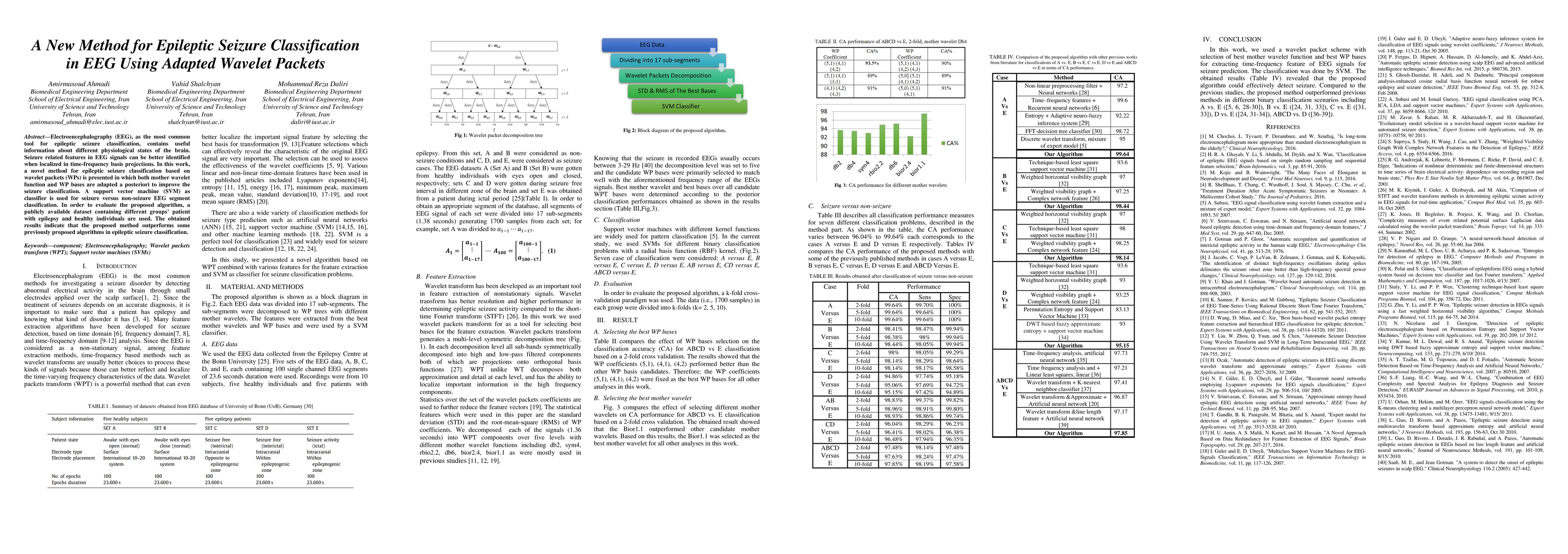 This paper introduces a new epileptic seizure classification method using adapted wavelet packets for feature extraction from EEG signals. The proposed method, combined with a support vector machine classifier, outperforms previous algorithms based on evaluation using a public dataset.