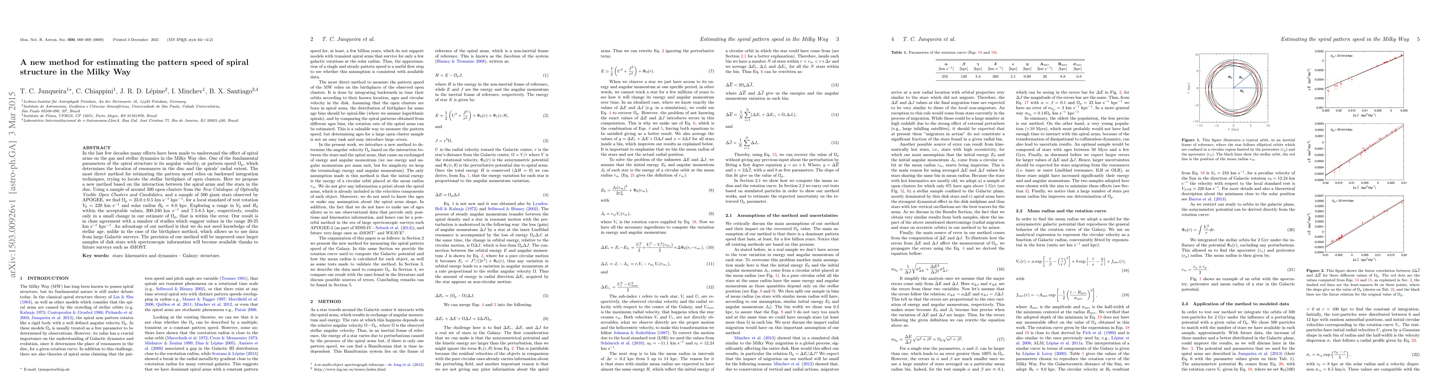 In the last few decades many efforts have been made to understand the effect of spiral arms on the gas and stellar dynamics in the Milky Way disc. One of the fundamental parameters of the spiral structure is its angular velocity, or pattern speed $\Omega_p$, which determines the location of resonances in the disc and the spirals' radial extent. The most direct method for estimating the pattern speed relies on backward integration techniques, trying to locate the stellar birthplace of open clusters. Here we propose a new method based on the interaction between the spiral arms and the stars in the disc. Using a sample of around 500 open clusters from the {\it New Catalogue of Optically Visible Open Clusters and Candidates}, and a sample of 500 giant stars observed by APOGEE, we find $\Omega_p = 23.0\pm0.5$ km s$^{-1}$ kpc$^{-1}$, for a local standard of rest rotation $V_0=220$~km s$^{-1}$ and solar radius $R_0=8.0$~kpc. Exploring a range in $V_0$ and $R_0$ within the acceptable values, 200-240 km s$^{-1}$ and 7.5-8.5 kpc, respectively, results only in a small change in our estimate of $\Omega_p$, that is within the error. Our result is in close agreement with a number of studies which suggest values in the range 20-25 km s$^{-1}$ kpc$^{-1}$. An advantage of our method is that we do not need knowledge of the stellar age, unlike in the case of the birthplace method, which allows us to use data from large Galactic surveys. The precision of our method will be improved once larger samples of disk stars with spectroscopic information will become available thanks to future surveys such as 4MOST.