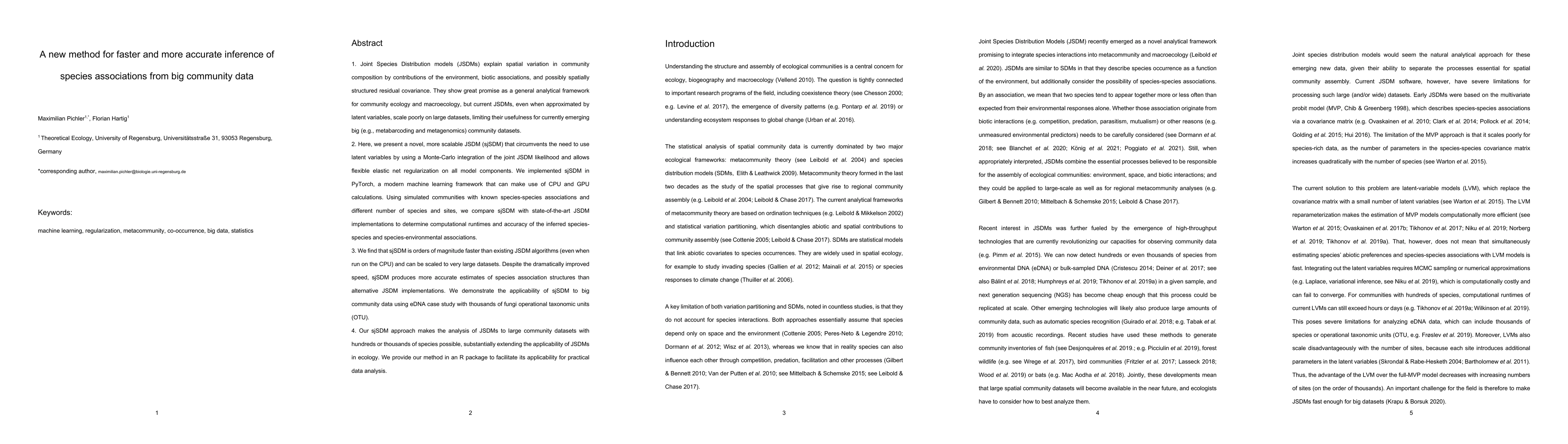 This paper introduces a novel scalable Joint Species Distribution Model (sjSDM) that leverages Monte-Carlo integration and elastic net regularization to significantly improve the speed and accuracy of species association inference from large community datasets. The sjSDM implementation in PyTorch enables efficient computation, making it applicable to big data in ecology.