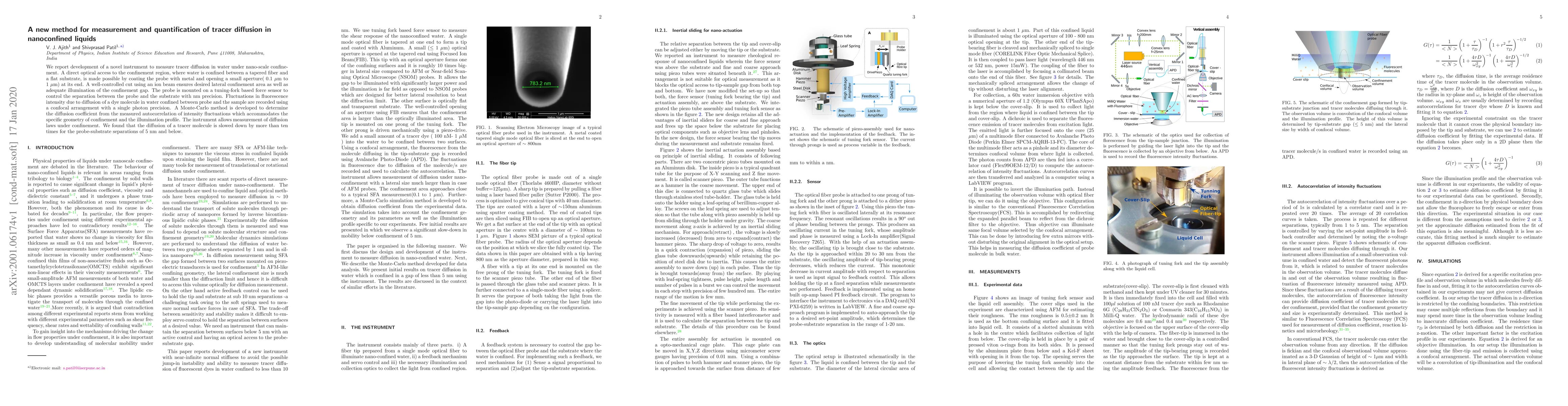 We report development of a novel instrument to measure tracer diffusion in water under nano-scale confinement. A direct optical access to the confinement region, where water is confined between a tapered fiber and a flat substrate, is made possible by coating the probe with metal and opening a small aperture( 0.1 $\mu$m to 1 $\mu$m) at its end. A well-controlled cut using an ion beam ensures desired lateral confinement area as well as adequate illumination of the confinement gap. The probe is mounted on a tuning-fork based force sensor to control the separation between the probe and the substrate with nm precision. Fluctuations in fluorescence intensity due to diffusion of a dye molecule in water confined between probe and the sample are recorded using a confocal arrangement with a single photon precision. A Monte-Carlo method is developed to determine the diffusion coefficient from the measured autocorrelation of intensity fluctuations which accommodates the specific geometry of confinement and the illumination profile. The instrument allows measurement of diffusion laws under confinement. We found that the diffusion of a tracer molecule is slowed down by more than ten times for the probe-substrate separations of 5 nm and below.