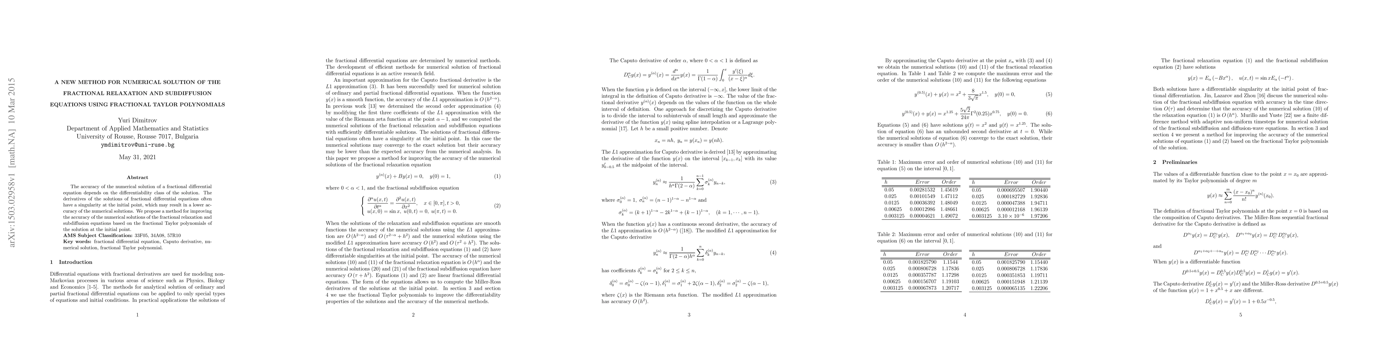 This paper proposes a new numerical method using fractional Taylor polynomials to enhance the accuracy of solutions for fractional relaxation and subdiffusion equations, addressing the issue of singularities in the initial derivatives of these solutions.