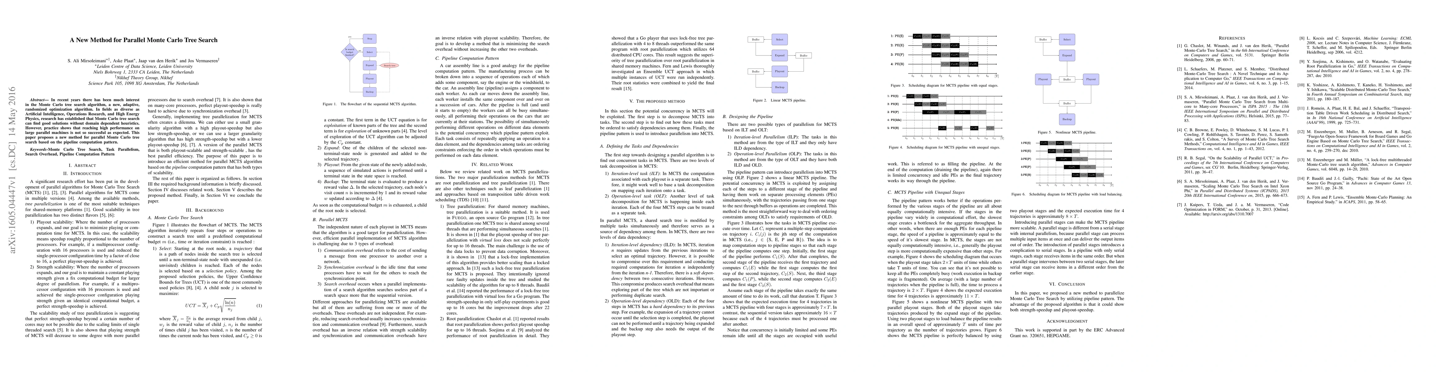 In recent years there has been much interest in the Monte Carlo tree search algorithm, a new, adaptive, randomized optimization algorithm. In fields as diverse as Artificial Intelligence, Operations Research, and High Energy Physics, research has established that Monte Carlo tree search can find good solutions without domain dependent heuristics. However, practice shows that reaching high performance on large parallel machines is not so successful as expected. This paper proposes a new method for parallel Monte Carlo tree search based on the pipeline computation pattern.