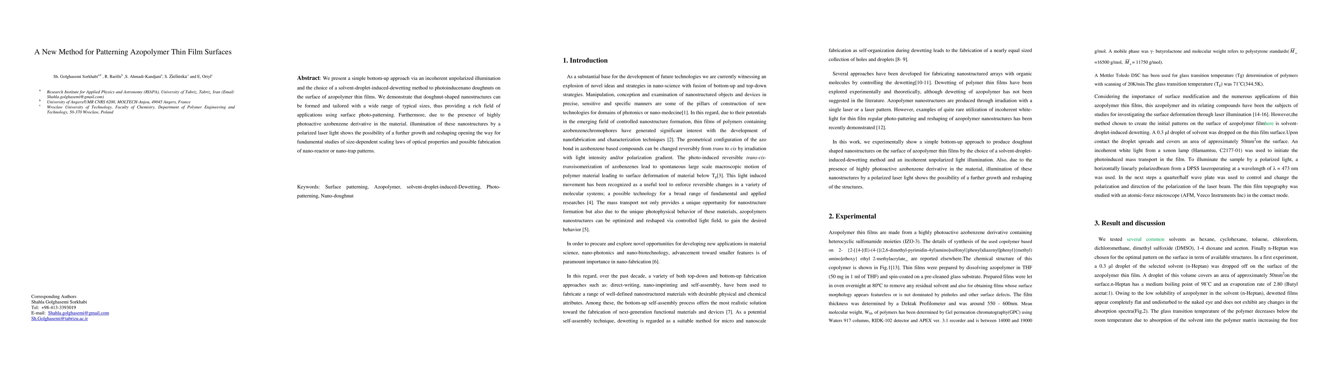 We present a simple bottom-up approach via an incoherent unpolarized illumination and the choice of a solvent-droplet-induced-dewetting method to photoinducenano doughnuts on the surface of azopolymer thin films. We demonstrate that doughnut-shaped nanostructures can be formed and tailored with a wide range of typical sizes, thus providing a rich field of applications using surface photo-patterning. Furthermore, due to the presence of highly photoactive azobenzene derivative in the material, illumination of these nanostructures by a polarized laser light shows the possibility of a further growth and reshaping opening the way for fundamental studies of size-dependent scaling laws of optical properties and possible fabrication of nano-reactor or nano-trap patterns