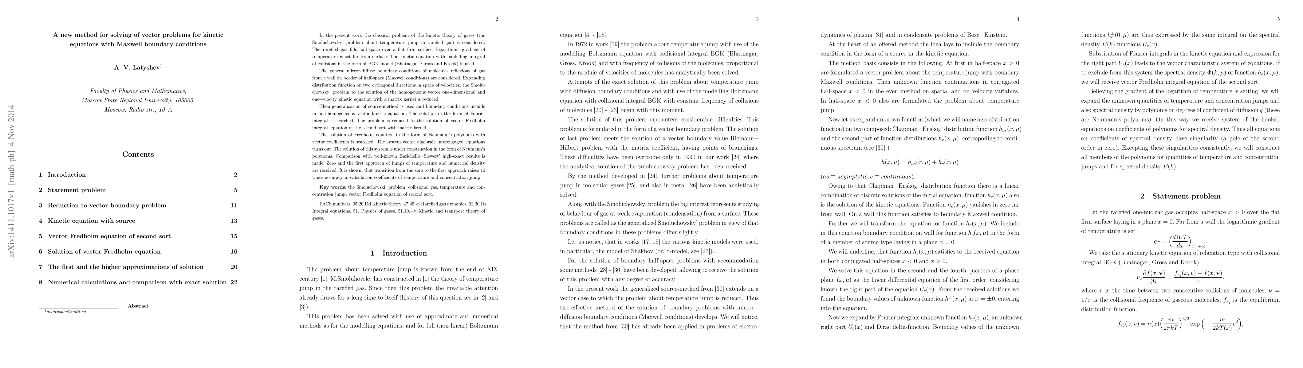 This paper proposes a new method to solve vector problems in kinetic equations for rarefied gases with Maxwell boundary conditions, specifically addressing the Smoluchowski problem of temperature jump. The method involves reducing the problem to a vector Fredholm integral equation and solving it using Neumann's polynomials, significantly improving the accuracy of calculated temperature and concentration jump coefficients.
