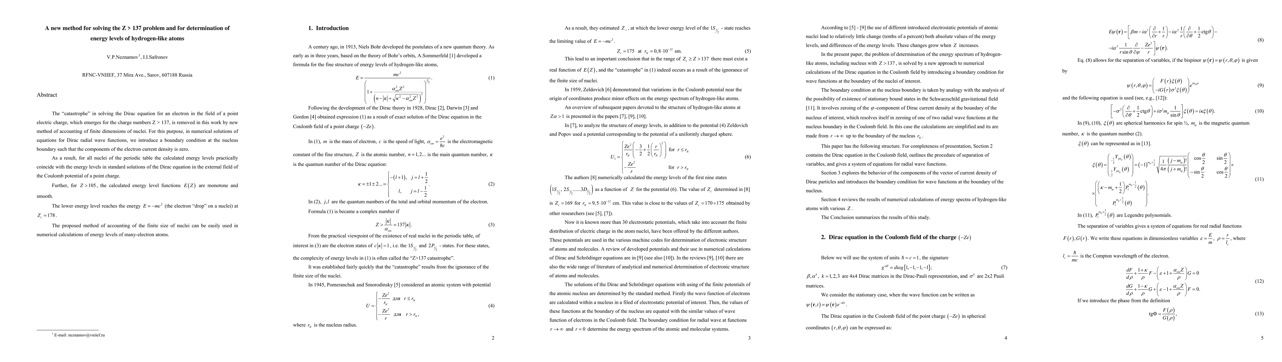Researchers develop a method to solve the Z>137 problem in hydrogen-like atoms by accounting for finite nuclear dimensions, achieving smooth and monotonic energy level functions, with the electron drop on nuclei reaching -mc^2 at Zc = 178.