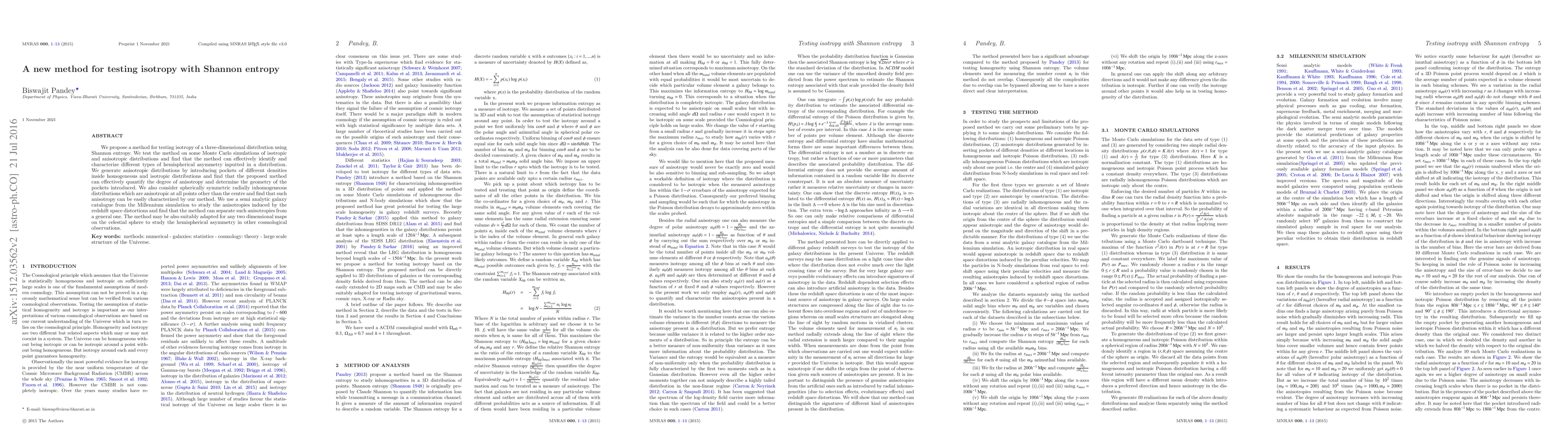 We propose a novel method for testing isotropy of a three-dimensional distribution using Shannon entropy. We test the method on some Monte Carlo simulations of isotropic and anisotropic distributions and find that the method can effectively identify and characterize different types of hemispherical asymmetry inputted in a distribution. We generate anisotropic distributions by introducing pockets of different densities inside homogeneous and isotropic distributions and find that the proposed method can effectively quantify the degree of anisotropy and determine the geometry of the pockets introduced. We also considered spherically symmetric radially inhomogeneous distributions which are anisotropic at all points other than the centre and find that such anisotropy can be easily characterized by our method. We use a semi analytic galaxy catalogue from the Millennium simulation to study the anisotropies induced by the redshift space distortions and find that the method can separate such anisotropies from a general one. The method may be also suitably adapted for any two dimensional maps on the celestial sphere to study the hemispherical asymmetry in other cosmological observations.