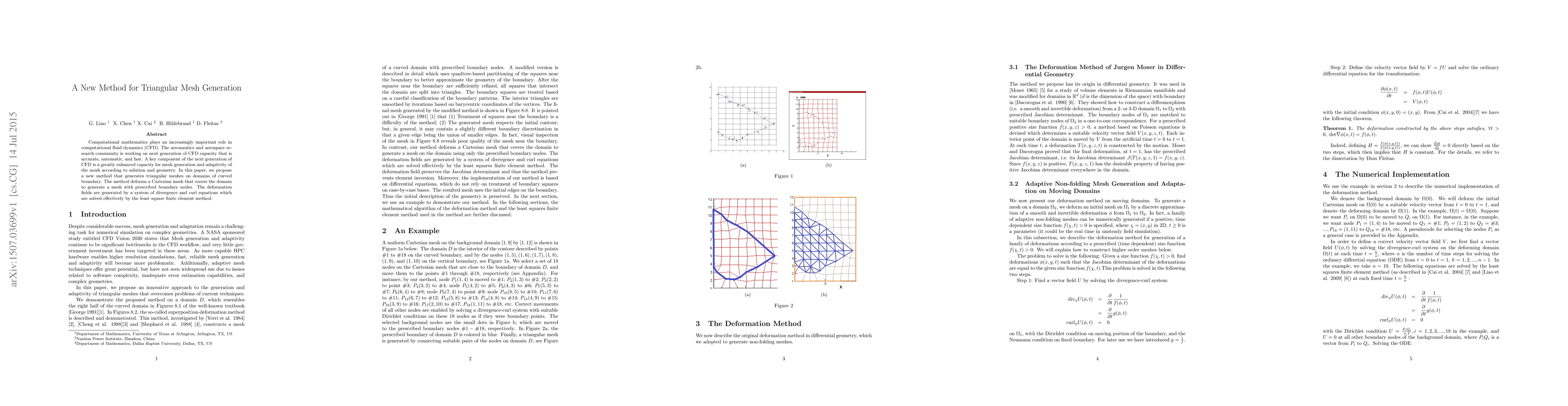 Computational mathematics plays an increasingly important role in computational fluid dynamics (CFD). The aeronautics and aerospace re- search community is working on next generation of CFD capacity that is accurate, automatic, and fast. A key component of the next generation of CFD is a greatly enhanced capacity for mesh generation and adaptivity of the mesh according to solution and geometry. In this paper, we propose a new method that generates triangular meshes on domains of curved boundary. The method deforms a Cartesian mesh that covers the domain to generate a mesh with prescribed boundary nodes. The deformation fields are generated by a system of divergence and curl equations which are solved effectively by the least square finite element method.