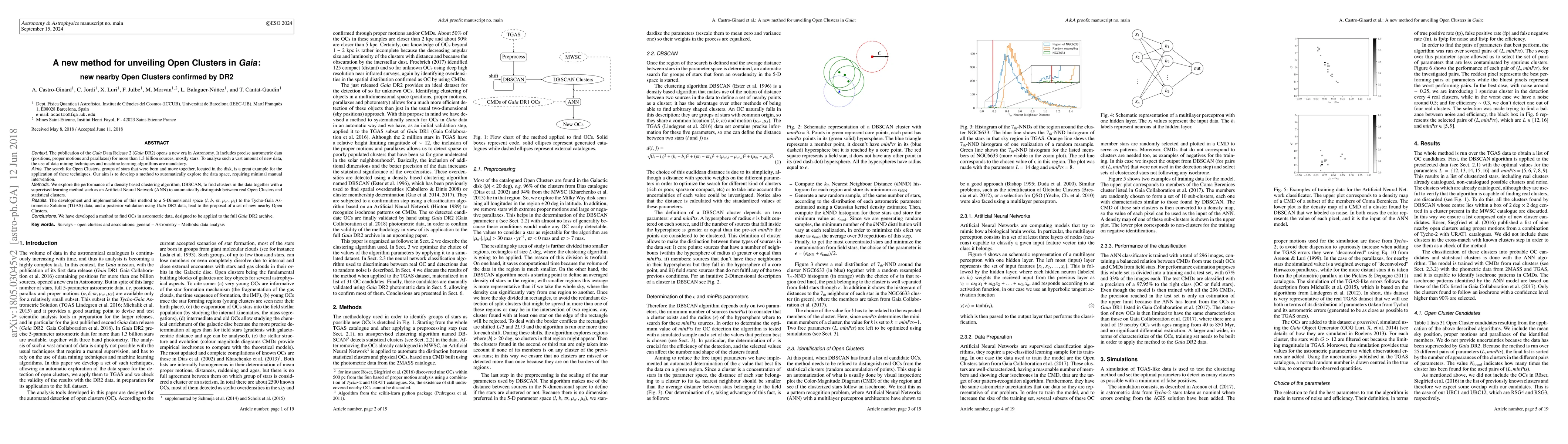 The publication of the Gaia Data Release 2 (Gaia DR2) opens a new era in Astronomy. It includes precise astrometric data (positions, proper motions and parallaxes) for more than $1.3$ billion sources, mostly stars. To analyse such a vast amount of new data, the use of data mining techniques and machine learning algorithms are mandatory. The search for Open Clusters, groups of stars that were born and move together, located in the disk, is a great example for the application of these techniques. Our aim is to develop a method to automatically explore the data space, requiring minimal manual intervention. We explore the performance of a density based clustering algorithm, DBSCAN, to find clusters in the data together with a supervised learning method such as an Artificial Neural Network (ANN) to automatically distinguish between real Open Clusters and statistical clusters. The development and implementation of this method to a $5$-Dimensional space ($l$, $b$, $\varpi$, $\mu_{\alpha^*}$, $\mu_\delta$) to the Tycho-Gaia Astrometric Solution (TGAS) data, and a posterior validation using Gaia DR2 data, lead to the proposal of a set of new nearby Open Clusters. We have developed a method to find OCs in astrometric data, designed to be applied to the full Gaia DR2 archive.