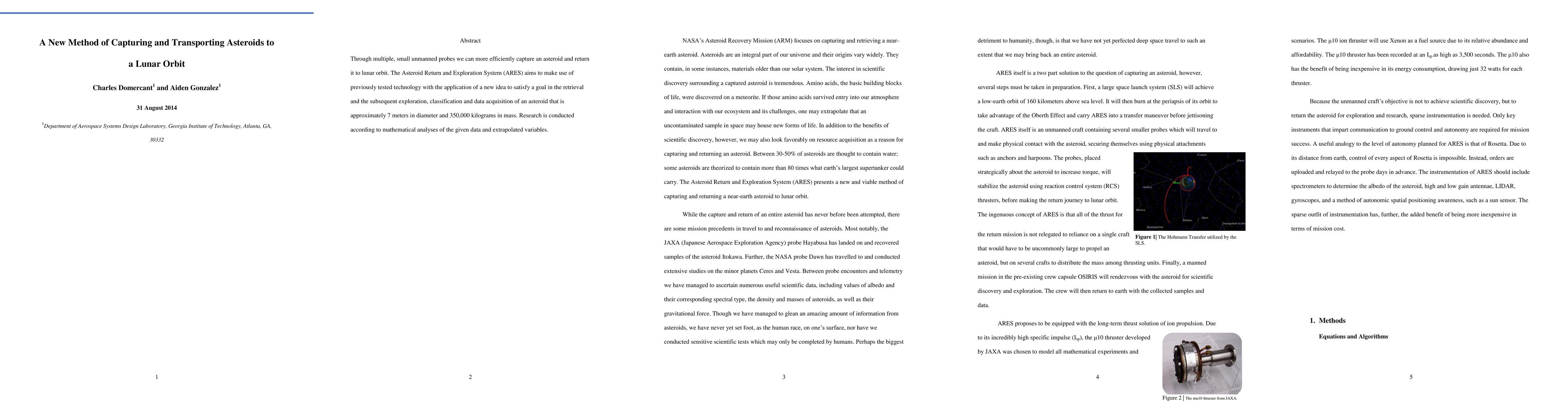 Through multiple, small unmanned probes we can more efficiently capture an asteroid and return it to lunar orbit. The Asteroid Return and Exploration System (ARES) aims to make use of previously tested technology with the application of a new idea to satisfy a goal in the retrieval and the subsequent exploration, classification and data acquisition of an asteroid that is approximately 7 meters in diameter and 350,000 kilograms in mass. Research is conducted according to mathematical analyses of the given data and extrapolated variables.