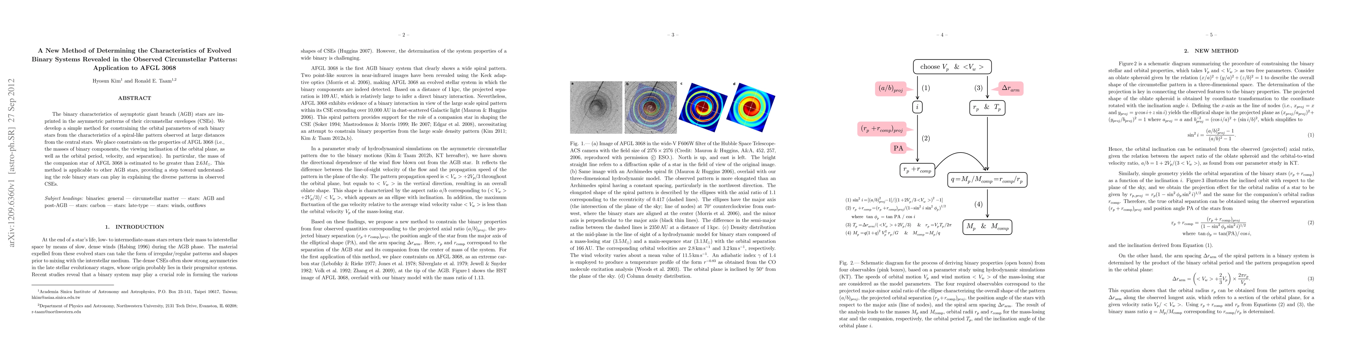 The binary characteristics of asymptotic giant branch (AGB) stars are imprinted in the asymmetric patterns of their circumstellar envelopes. We develop a simple method for constraining the orbital parameters of such binary stars from the characteristics of a spiral-like pattern observed at large distances from the central stars. We place constraints on the properties of AFGL 3068 (i.e., the masses of binary components, the viewing inclination of the orbital plane, as well as the orbital period, velocity, and separation). In particular, the mass of the companion star of AFGL 3068 is estimated to be greater than 2.6 solar mass. This method is applicable to other AGB stars, providing a step toward understanding the role binary stars can play in explaining the diverse patterns in observed circumstellar envelopes.